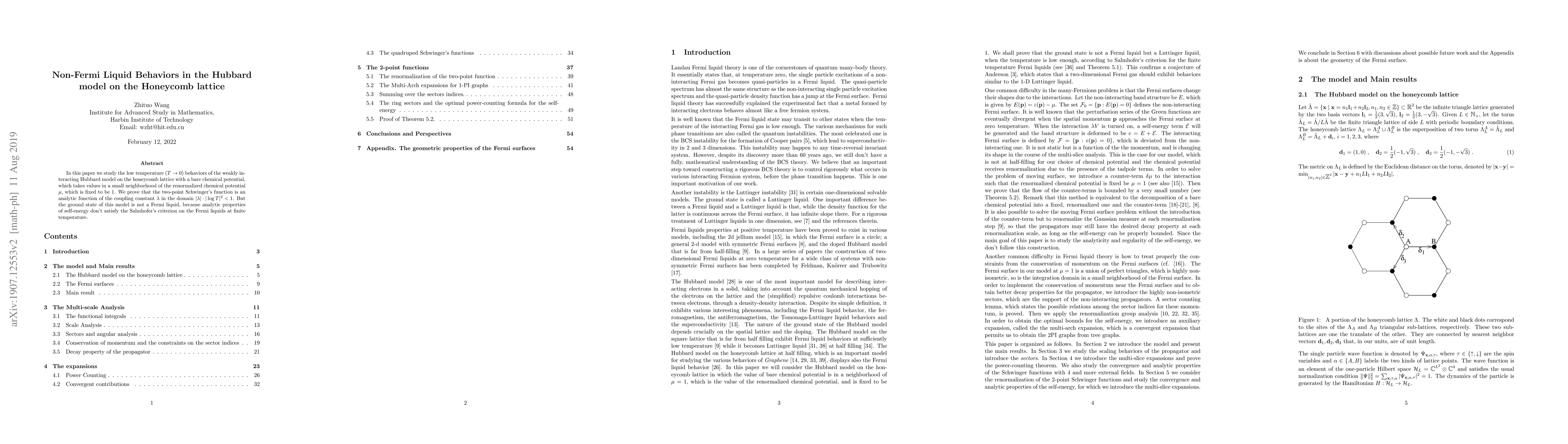 In this paper we study the low temperature ($T\rightarrow 0$) behaviors of the weakly interacting Hubbard model on the honeycomb lattice with a bare chemical potential, which takes values in a small neighborhood of the renormalized chemical potential $\mu$, which is fixed to be $1$. We prove that the two-point Schwinger's function is an analytic function of the coupling constant $\lambda$ in the domain $|\lambda|\cdot|\log T|^2<1$. But the ground state of this model is not a Fermi liquid, because analytic properties of self-energy don't satisfy the Salmhofer's criterion on the Fermi liquids at finite temperature.