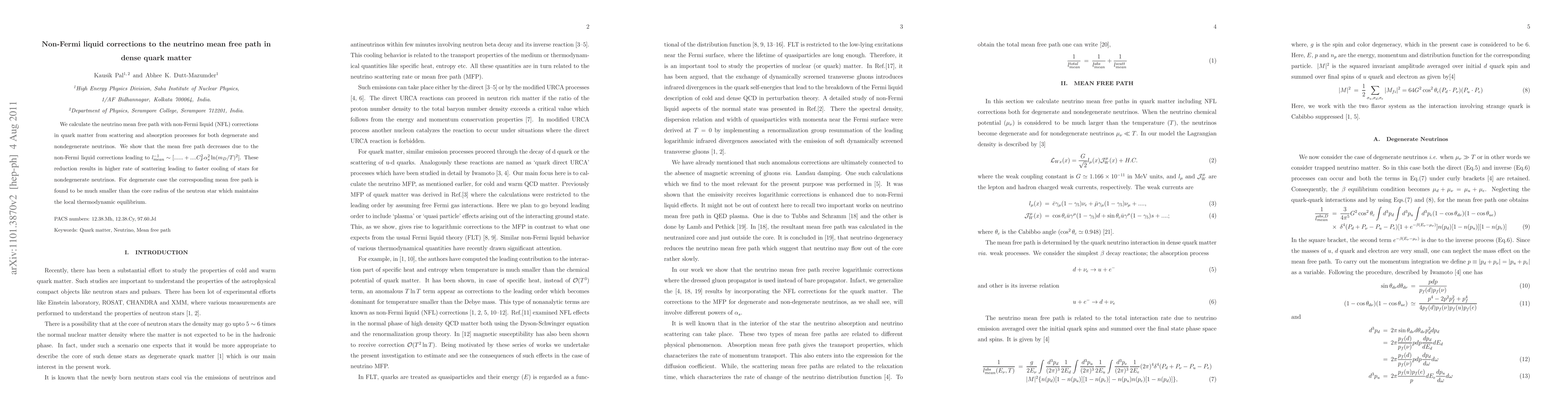 This paper calculates the neutrino mean free path in dense quark matter, incorporating non-Fermi liquid corrections. It finds that these corrections lead to a decrease in the mean free path, resulting in a higher scattering rate.