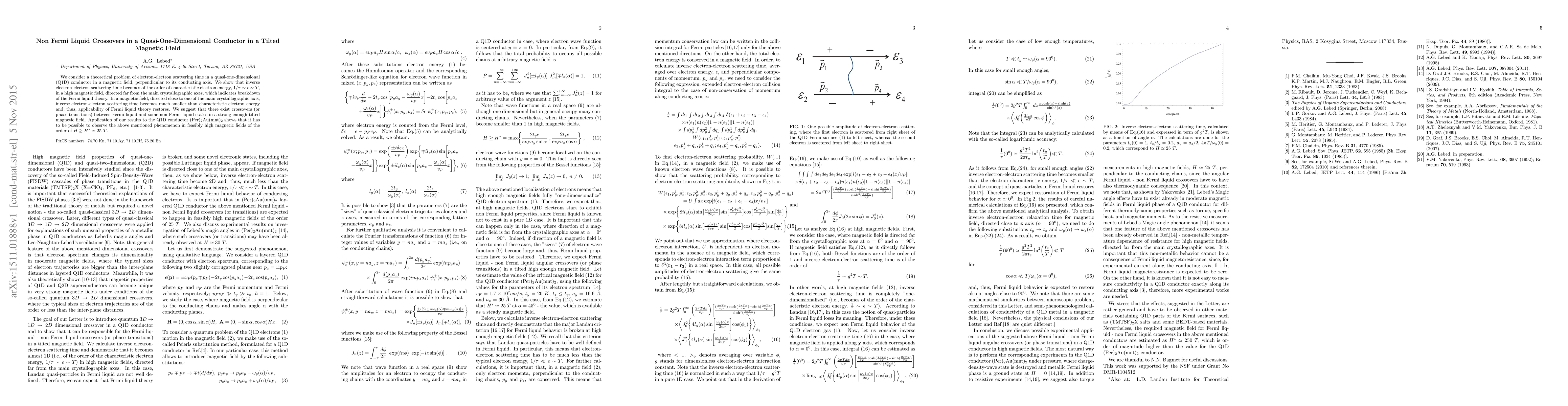 This paper explores electron-electron scattering in a quasi-one-dimensional conductor under a tilted magnetic field, demonstrating a crossover from Fermi liquid to non-Fermi liquid states as the field strength increases, with potential experimental observation in the compound (Per)$_2$Au(mnt)$_2$ at high magnetic fields around 25 T.