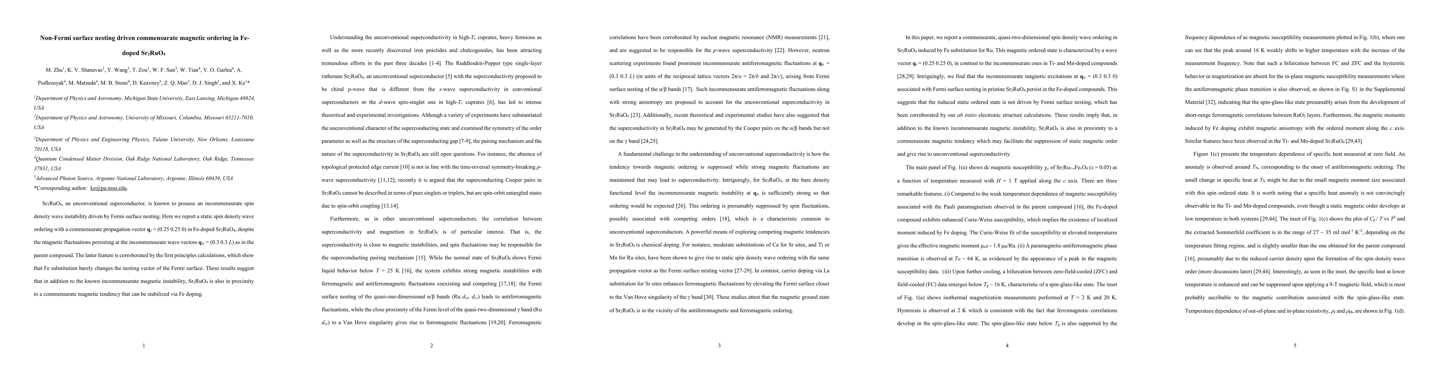 This paper reports the discovery of a static commensurate spin density wave in Fe-doped Sr$_2$RuO$_4$, despite the persistence of incommensurate magnetic fluctuations. First principles calculations indicate that Fe doping does not significantly alter the Fermi surface nesting, suggesting a new magnetic ordering mechanism beyond conventional nesting.