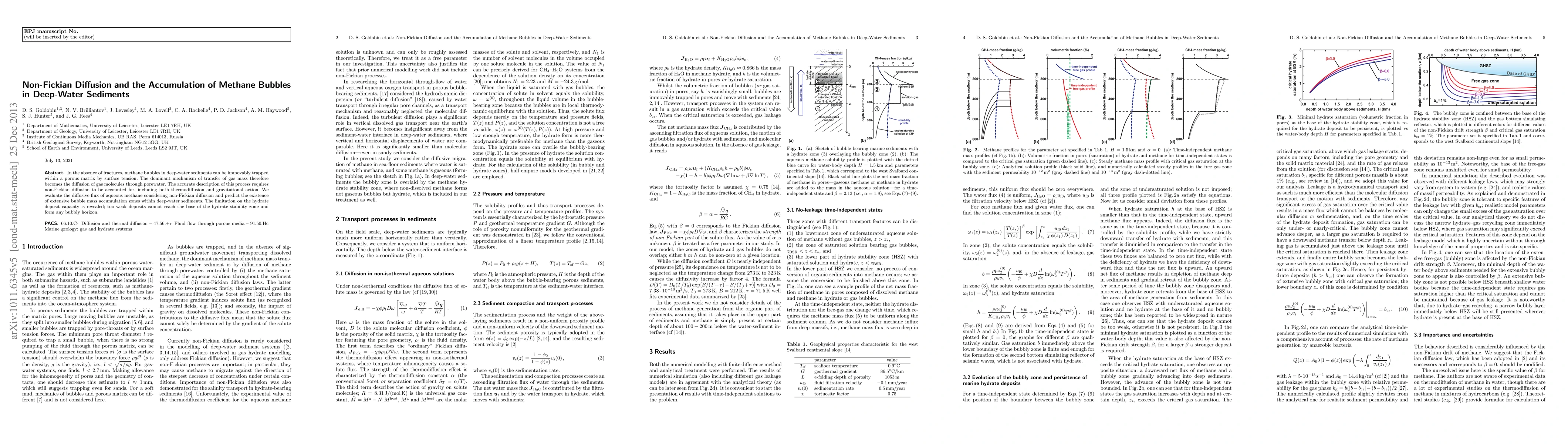 This paper explores the diffusion of methane bubbles in deep-water sediments, focusing on non-Fickian diffusion mechanisms that include thermodiffusion and gravitational effects. It predicts significant methane accumulation zones and highlights the limitations on hydrate deposit capacity due to the inability of weak deposits to reach the base of the hydrate stability zone.