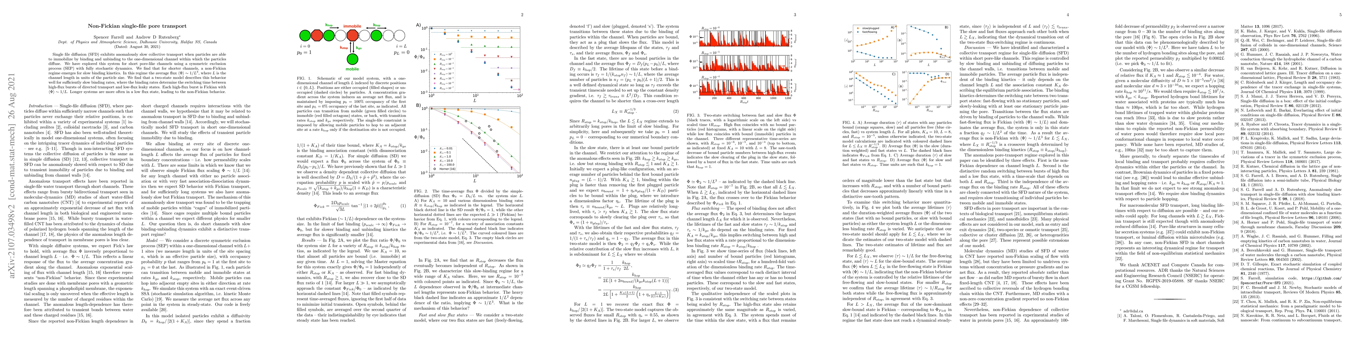 The study explores single-file diffusion (SFD) within short pore-like channels using a symmetric exclusion process (SEP) with fully stochastic dynamics, focusing on non-Fickian transport regime for slow binding kinetics.