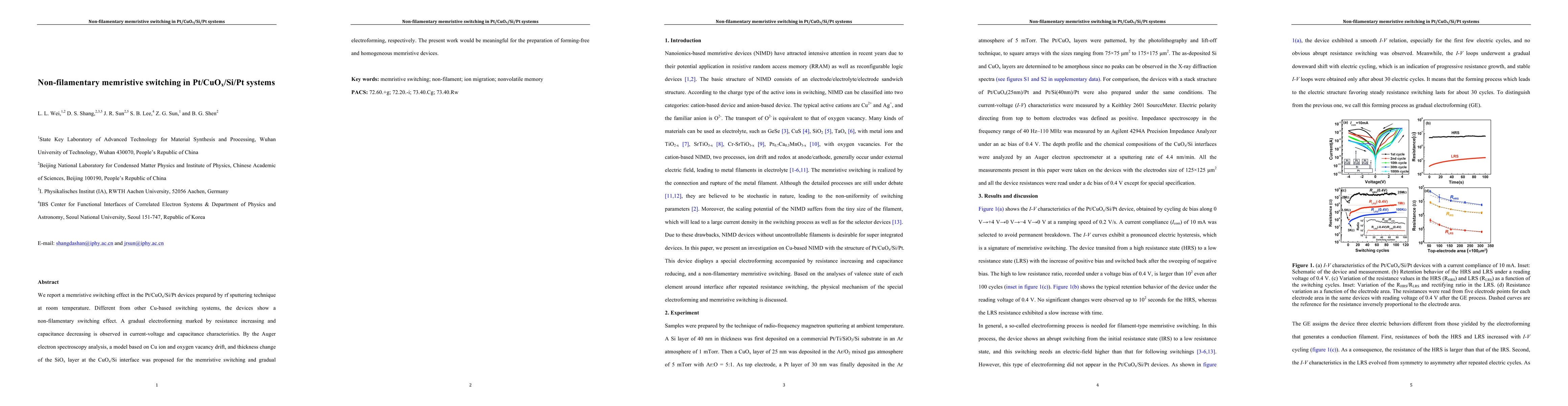 This paper reports a non-filamentary memristive switching effect in Pt/CuOx/Si/Pt devices prepared via rf sputtering, characterized by gradual electroforming. The study proposes a model based on Cu ion and oxygen vacancy drift, and SiOx layer thickness change at the CuOx/Si interface, which could lead to the development of forming-free and homogeneous memristive devices.