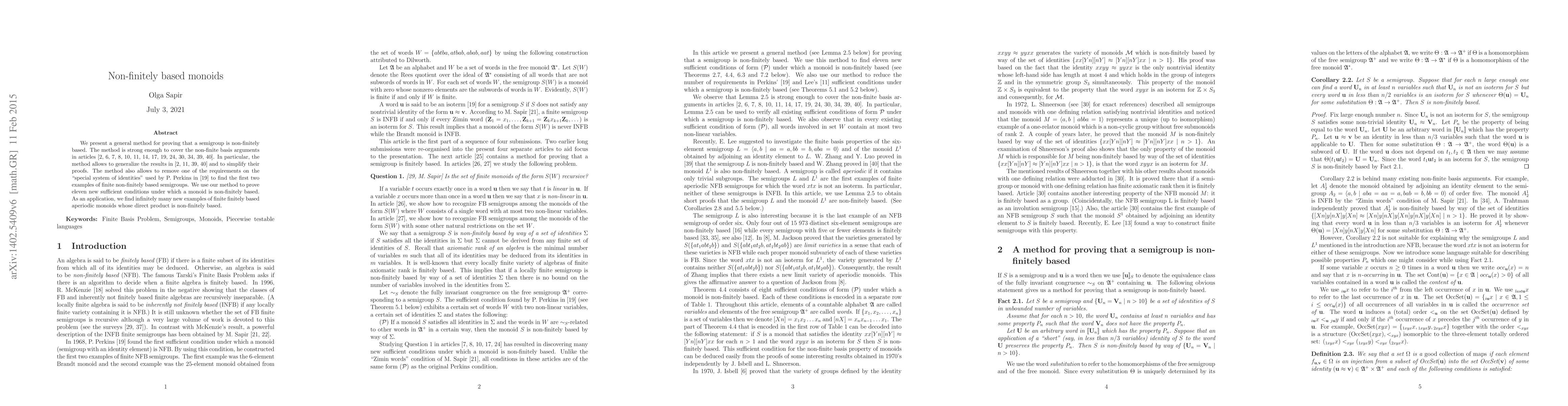 We present a general method for proving that a semigroup is non-finitely based. The method is strong enough to cover the non-finite basis arguments in articles [1,3,4,5,7,8, 11,14,16,21,27,31,36,37]. In particular, the method allows to generalize the results in [1,8,36,37] and to simplify their proofs. The method also allows to remove one of the requirements on the "special system of identities" used by P. Perkins in [16] to find the first two examples of finite non-finitely based semigroups. We use our method to prove eleven new sufficient conditions under which a monoid is non-finitely based. As an application, we find infinitely many new examples of finite finitely based aperiodic monoids whose direct product is non-finitely based.