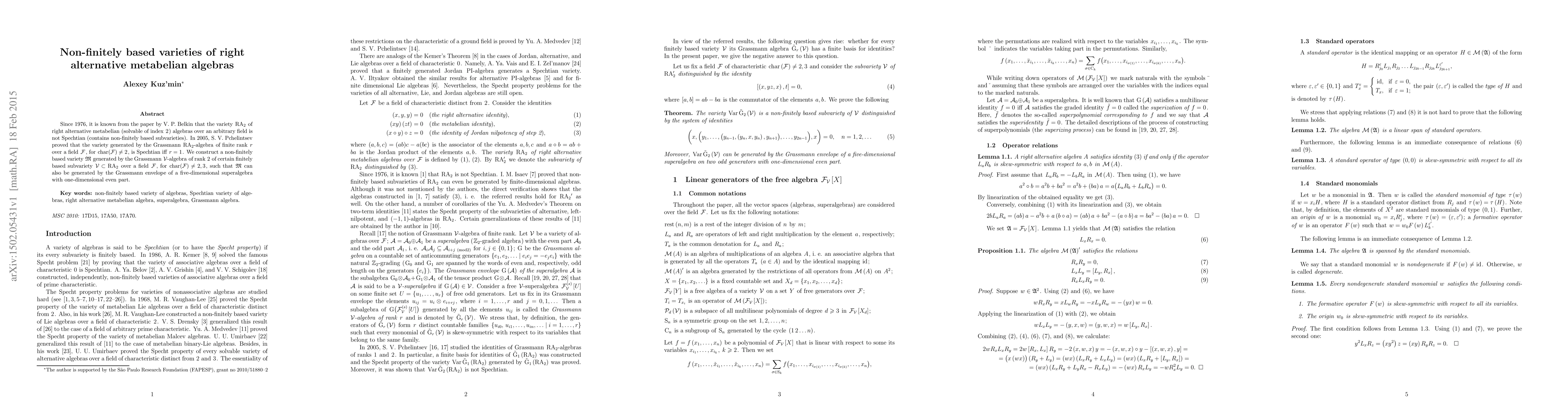 Since 1976, it is known from the paper by V. P. Belkin that the variety $\mathrm{RA_2}$ of right alternative metabelian (solvable of index 2) algebras over an arbitrary field is not Spechtian (contains non-finitely based subvarieties). In 2005, S. V. Pchelintsev proved that the variety generated by the Grassmann $\mathrm{RA_2}$-algebra of finite rank $r$ over a field $\mathcal{F}$, for $\mathrm{char}(\mathcal{F})\neq2$, is Spechtian iff $r=1$. We construct a non-finitely based variety $\mathfrak{M}$ generated by the Grassmann $\mathcal{V}$-algebra of rank $2$ of certain finitely based subvariety $\mathcal V\subset\mathrm{RA}_2$ over a field $\mathcal{F}$, for $\mathrm{char(\mathcal{F})}\neq2,3$, such that $\mathfrak{M}$ can also be generated by the Grassmann envelope of a five-dimensional superalgebra with one-dimensional even part.