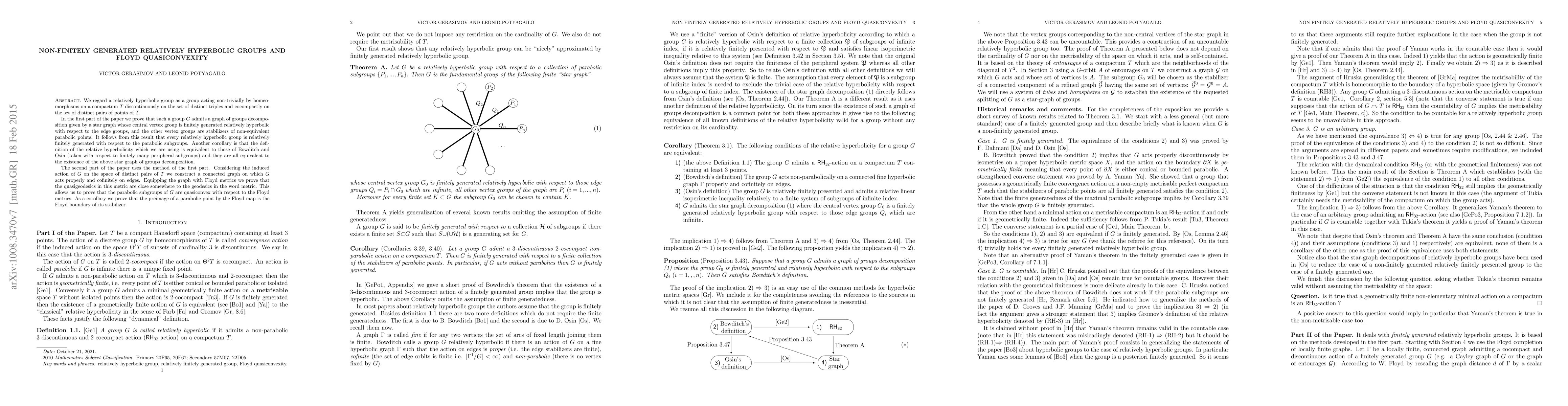 The paper consists of two parts. In the first one we show that a relatively hyperbolic group $G$ splits as a star graph of groups whose central vertex group is finitely generated and the other vertex groups are maximal parabolic subgroups. As a corollary we obtain that every group which admits 3-discontinuous and 2-cocompact action by homeomorphisms on a compactum is finitely generated with respect to a system of parabolic subgroups. The second part essentially uses the methods of topological entourages developed in the first part. Using also Floyd metrics we obtain finer properties of finitely generated relatively hyperbolic groups. We show that there is a system of "tight" curves satisfying the property of horospherical quasiconvexity. We then prove that the Floyd quasigeodesics are tight and so the parabolic subgroups of $G$ are quasiconvex with respect to the Floyd metrics. As a corollary we obtain that the preimage of a parabolic point by the Floyd map is the Floyd boundary of its stabilizer.