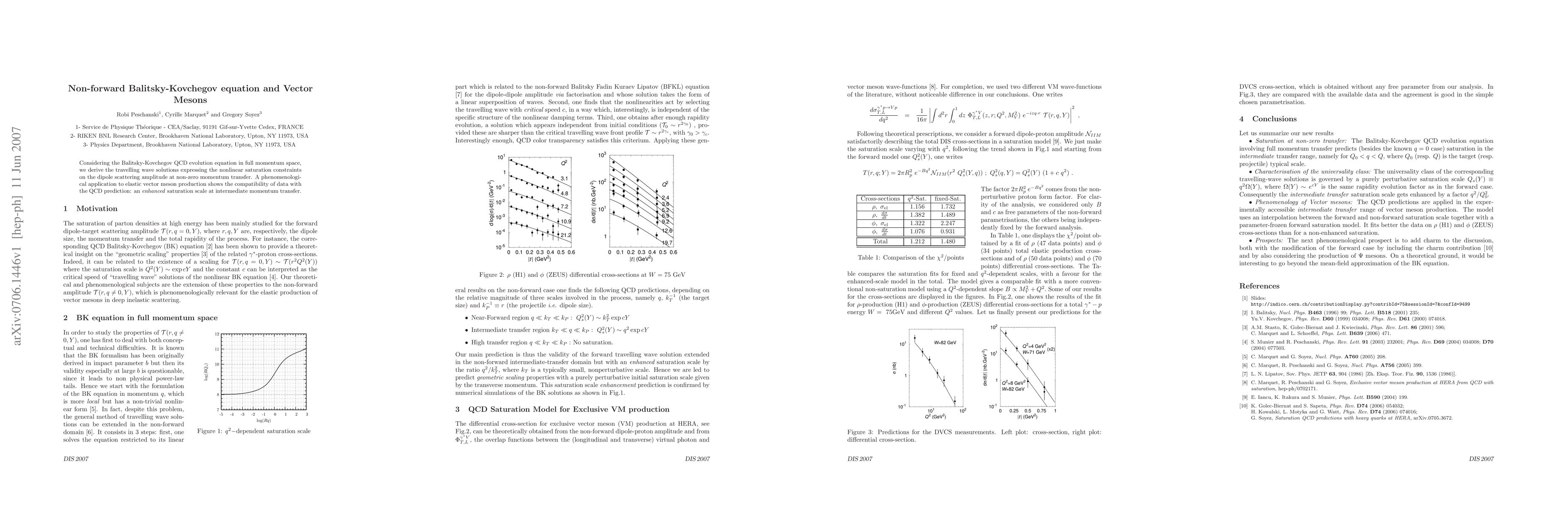 The paper derives travelling wave solutions for the non-forward Balitsky-Kovchegov equation in QCD, revealing nonlinear saturation constraints. This framework is then applied to vector meson production, demonstrating agreement between QCD predictions and experimental data on saturation scales.