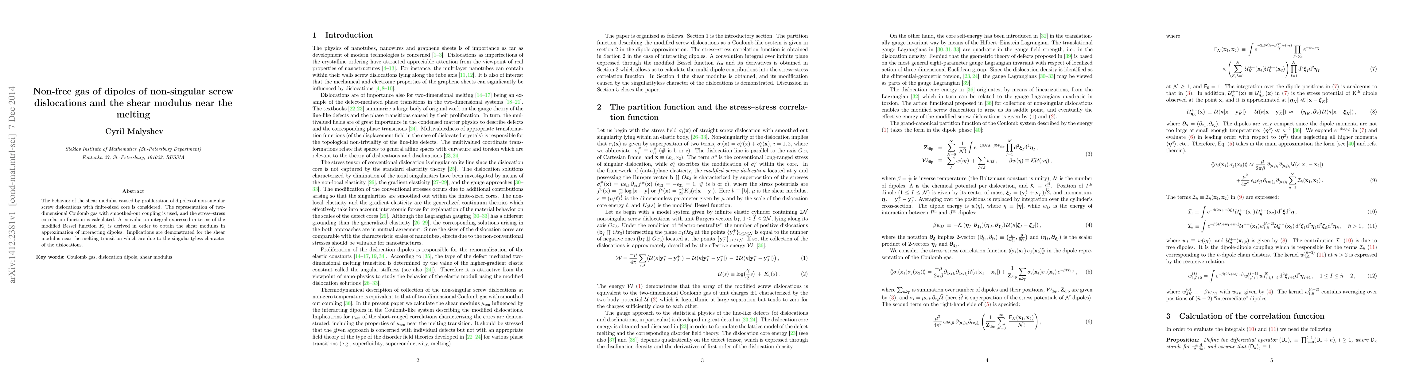 The behavior of the shear modulus caused by proliferation of dipoles of non-singular screw dislocations with finite-sized core is considered. The representation of two-dimensional Coulomb gas with smoothed-out coupling is used, and the stress-stress correlation function is calculated. A convolution integral expressed in terms of the modified Bessel function $K_0$ is derived in order to obtain the shear modulus in approximation of interacting dipoles. Implications are demonstrated for the shear modulus near the melting transition which are due to the singularityless character of the dislocations.