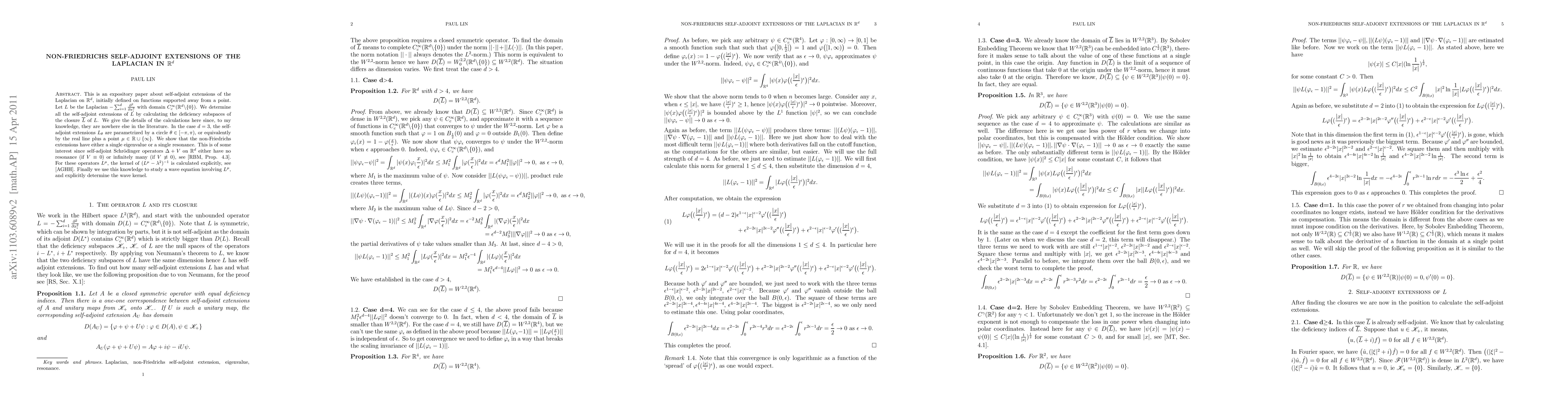 This paper explores self-adjoint extensions of the Laplacian on R^d, defined initially on functions away from a point, and determines these extensions by analyzing the deficiency subspaces. For d=3, these extensions are parametrized by a circle, revealing that non-Friedrichs extensions possess either a single eigenvalue or resonance, with explicit calculations of the resolvent kernel and wave equation kernel.