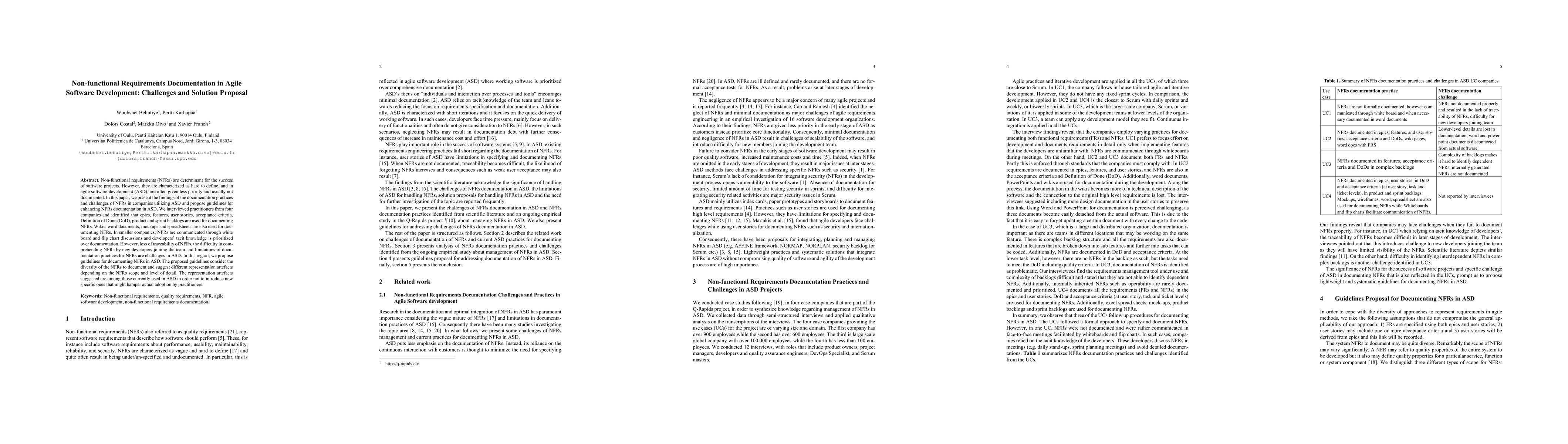 Non-functional requirements (NFRs) are determinant for the success of software projects. However,they are characterized as hard to define, and in agile software development(ASD), are often given less priority and usually not documented. In this paper, we present the findings of the documentation practices and challenges of NFRs in companies utilizing ASD and propose guidelines for enhancing NFRs documentation in ASD. We interviewed practitioners from four companies and identified that epics, features, user stories, acceptance criteria,Definition of Done(DoD), product and sprint backlogs are used for documenting NFRS. Please refer to the manuscript for the full abstract.
