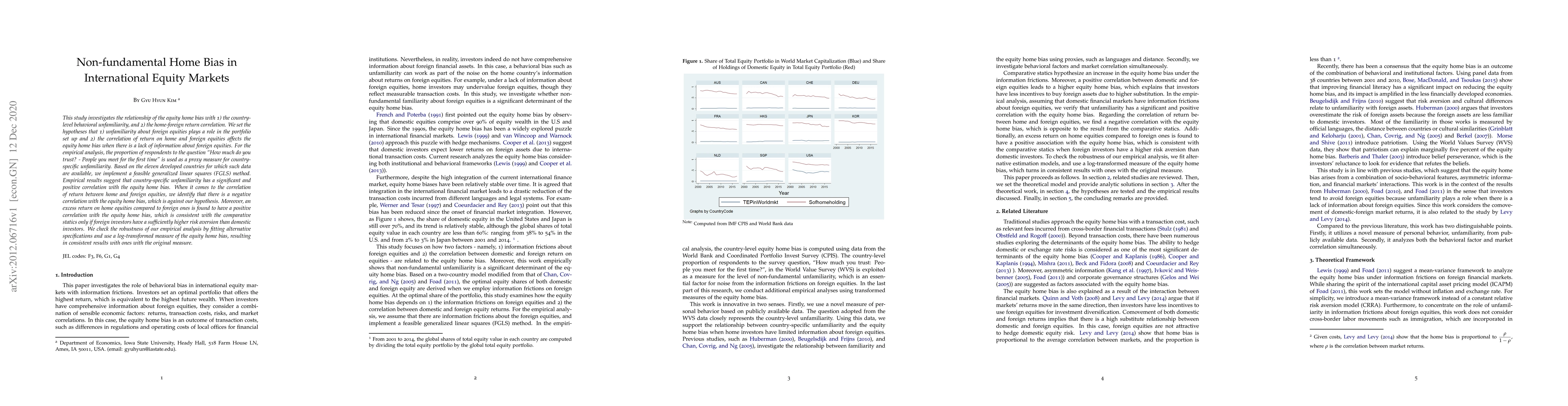 This study investigates the relationship of the equity home bias with 1) the country-level behavioral unfamiliarity, and 2) the home-foreign return correlation. We set the hypotheses that 1) unfamiliarity about foreign equities plays a role in the portfolio set up and 2) the correlation of return on home and foreign equities affects the equity home bias when there is a lack of information about foreign equities. For the empirical analysis, the proportion of respondents to the question "How much do you trust? - People you meet for the first time" is used as a proxy measure for country-specific unfamiliarity. Based on the eleven developed countries for which such data are available, we implement a feasible generalized linear squares (FGLS) method. Empirical results suggest that country-specific unfamiliarity has a significant and positive correlation with the equity home bias. When it comes to the correlation of return between home and foreign equities, we identify that there is a negative correlation with the equity home bias, which is against our hypothesis. Moreover, an excess return on home equities compared to foreign ones is found to have a positive correlation with the equity home bias, which is consistent with the comparative statics only if foreign investors have a sufficiently higher risk aversion than domestic investors. We check the robustness of our empirical analysis by fitting alternative specifications and use a log-transformed measure of the equity home bias, resulting in consistent results with ones with the original measure.