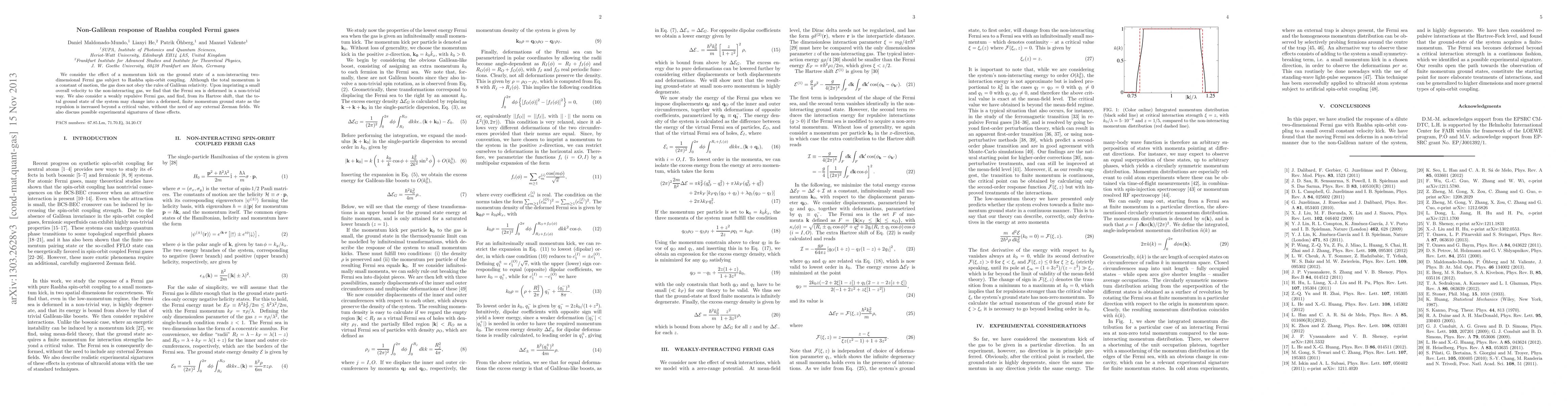 We consider the effect of a momentum kick on the ground state of a non-interacting two-dimensional Fermi gas subject to Rashba spin-orbit coupling. Although the total momentum is a constant of motion, the gas does not obey the rules of Galilean relativity. Upon imprinting a small overall velocity to the non-interacting gas, we find that the Fermi sea is deformed in a non-trivial way. We also consider a weakly repulsive Fermi gas, and find, from its Hartree shift, that the total ground state of the system may change into a deformed, finite momentum ground state as the repulsion is increased beyond a critical value, without the need of any external Zeeman fields. We also discuss possible experimental signatures of these effects.