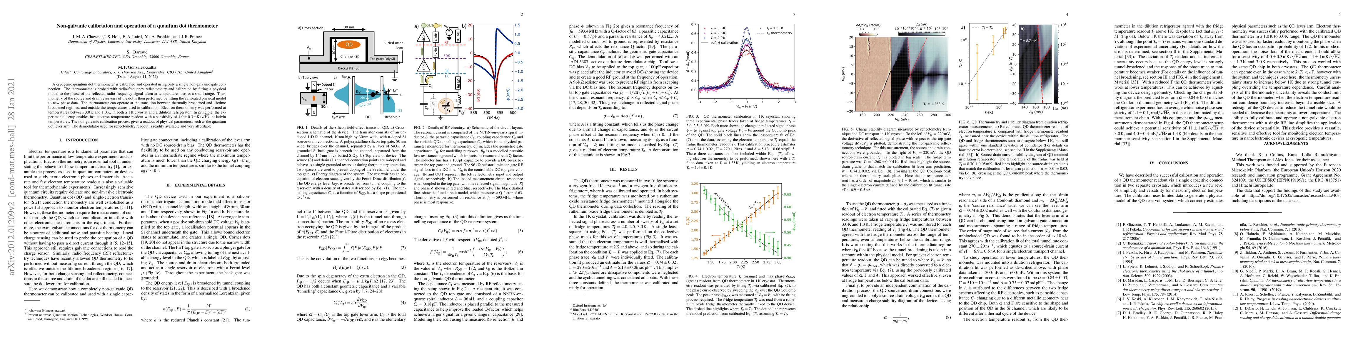 A cryogenic quantum dot thermometer is calibrated and operated using only a single non-galvanic gate connection. The thermometer is probed with radio-frequency reflectometry and calibrated by fitting a physical model to the phase of the reflected radio-frequency signal taken at temperatures across a small range. Thermometry of the source and drain reservoirs of the dot is then performed by fitting the calibrated physical model to new phase data. The thermometer can operate at the transition between thermally broadened and lifetime broadened regimes, and outside the temperatures used in calibration. Electron thermometry was performed at temperatures between $3.0\,\mathrm{K}$ and $1.0\,\mathrm{K}$, in both a $1\,\mathrm{K}$ cryostat and a dilution refrigerator. The experimental setup allows fast electron temperature readout with a sensitivity of $4.0\pm0.3 \, \mathrm{mK}/\sqrt{\mathrm{Hz}}$, at Kelvin temperatures. The non-galvanic calibration process gives a readout of physical parameters, such as the quantum dot lever arm. The demodulator used for reflectometry readout is readily available and very affordable.