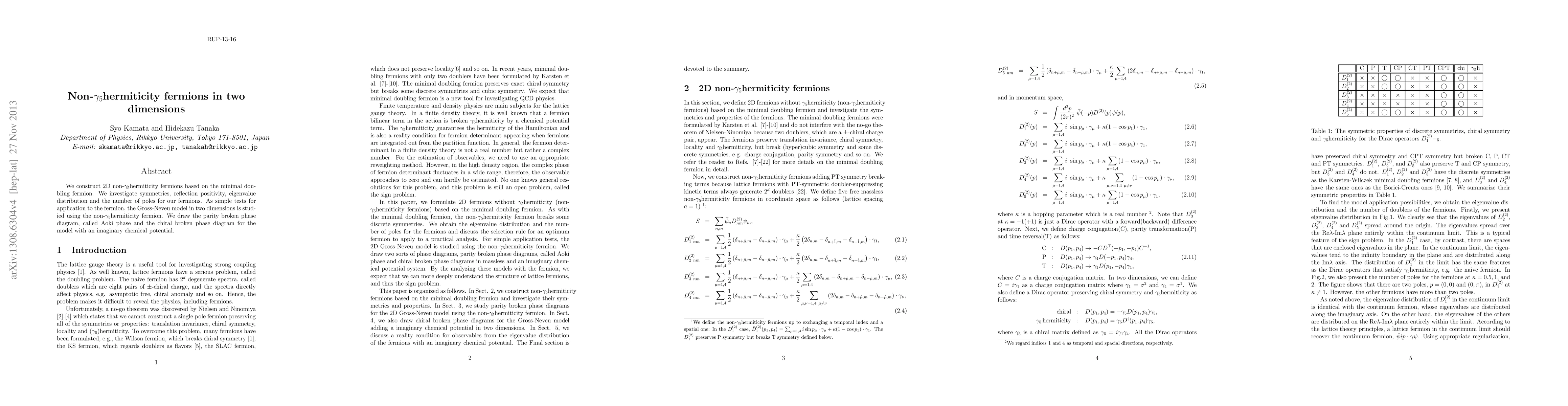 This paper constructs 2D fermions with non-$\gamma_{5}$hermiticity, explores their symmetries and properties, and applies them to the Gross-Neveu model to study phase diagrams with imaginary chemical potential, revealing parity and chiral broken phases.