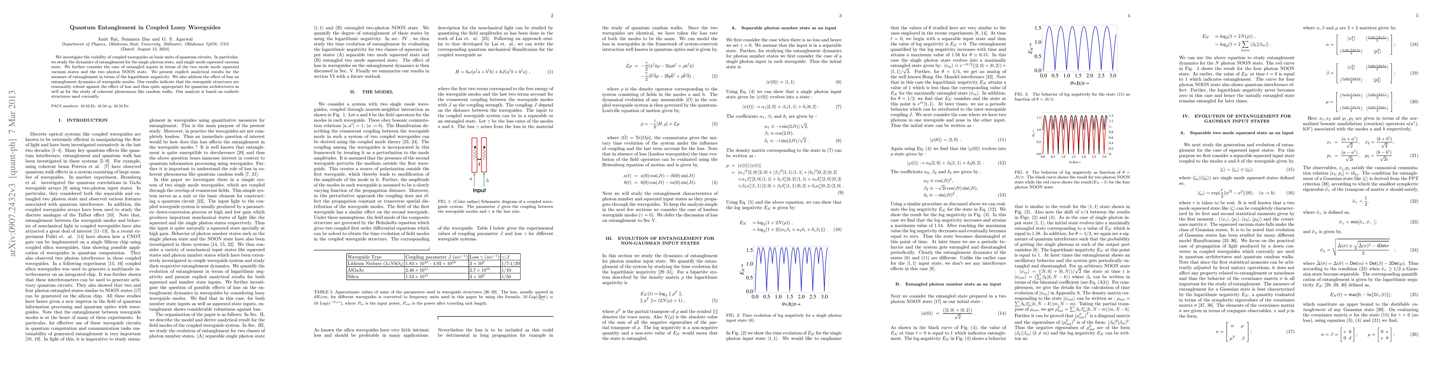 This paper explores the dynamics of entanglement in coupled leaky waveguides, analyzing both Gaussian and non-Gaussian states, including single photon, squeezed vacuum, and two-photon NOON states. It finds that the waveguide structures maintain robustness against loss, making them suitable for quantum circuits and coherent phenomena studies.