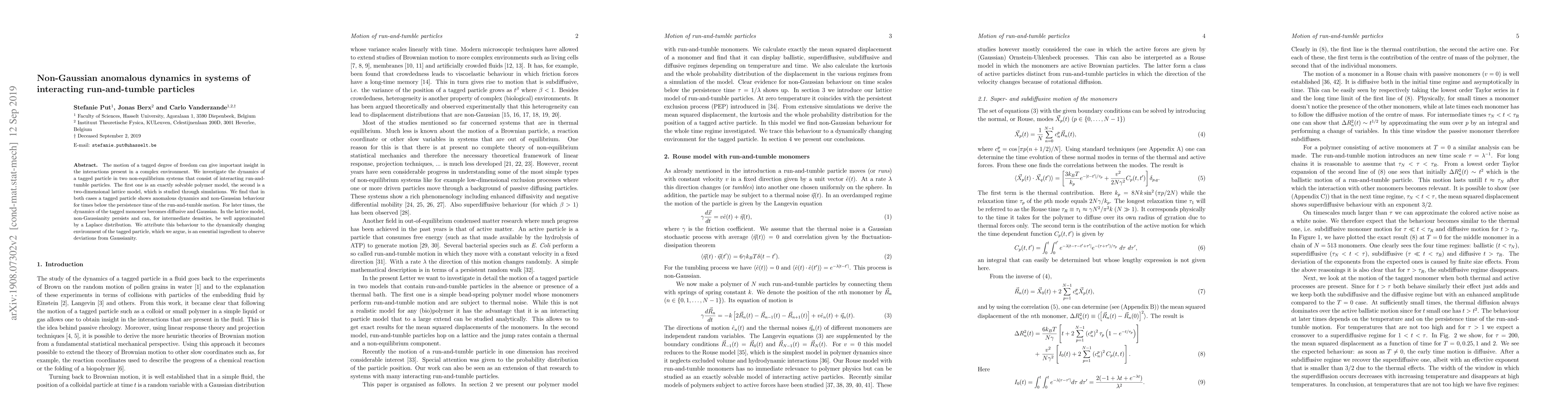 The motion of a tagged degree of freedom can give important insight in the interactions present in a complex environment. We investigate the dynamics of a tagged particle in two non-equilibrium systems that consist of interacting run-and-tumble particles. The first one is an exactly solvable polymer model, the second is a two-dimensional lattice model, which is studied through simulations. We find that in both cases a tagged particle shows anomalous dynamics and non-Gaussian behaviour for times below the persistence time of the run-and-tumble motion. For later times, the dynamics of the tagged monomer becomes diffusive and Gaussian. In the lattice model, non-Gaussianity persists and can, for intermediate densities, be well approximated by a Laplace distribution. We attribute this behaviour to the dynamically changing environment of the tagged particle, which we argue, is an essential ingredient to observe deviations from Gaussianity.