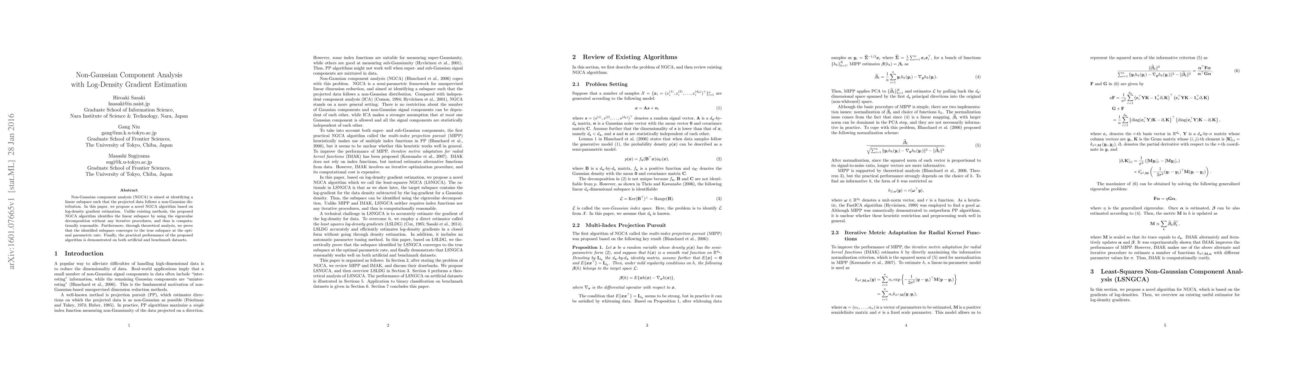 This paper proposes a novel non-Gaussian component analysis (NGCA) algorithm based on log-density gradient estimation, which identifies the optimal linear subspace via eigenvalue decomposition without iterative procedures, ensuring computational efficiency. Theoretical analysis confirms convergence to the true subspace at the optimal rate, and practical performance is validated on both artificial and benchmark datasets.