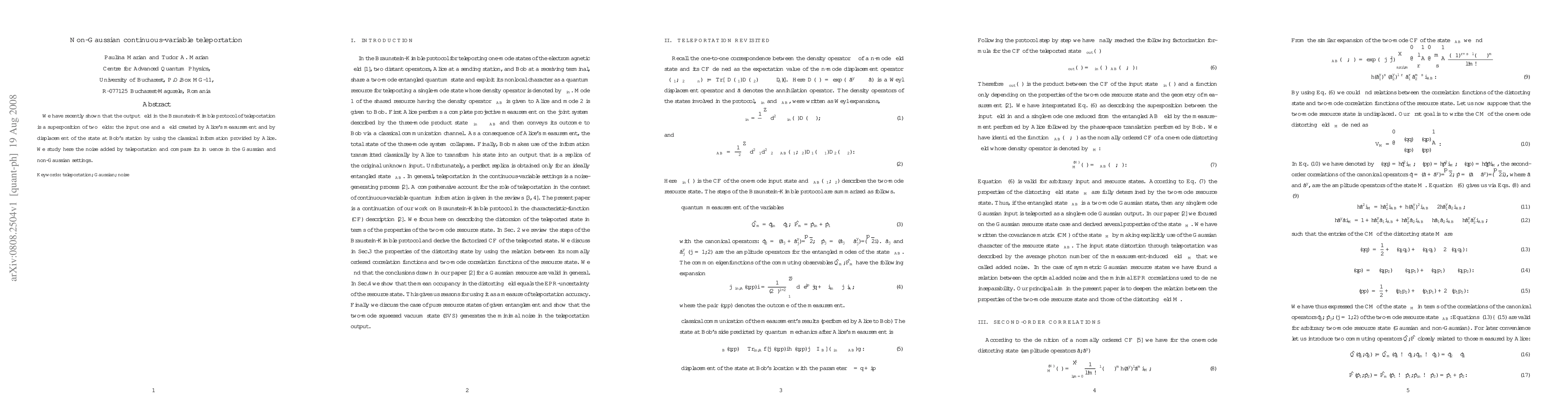 Summary: This paper investigates the noise characteristics in the Braunstein-Kimble protocol of continuous-variable teleportation, showing that the output field is a superposition of input and newly created fields. It compares the noise influence in Gaussian versus non-Gaussian settings.