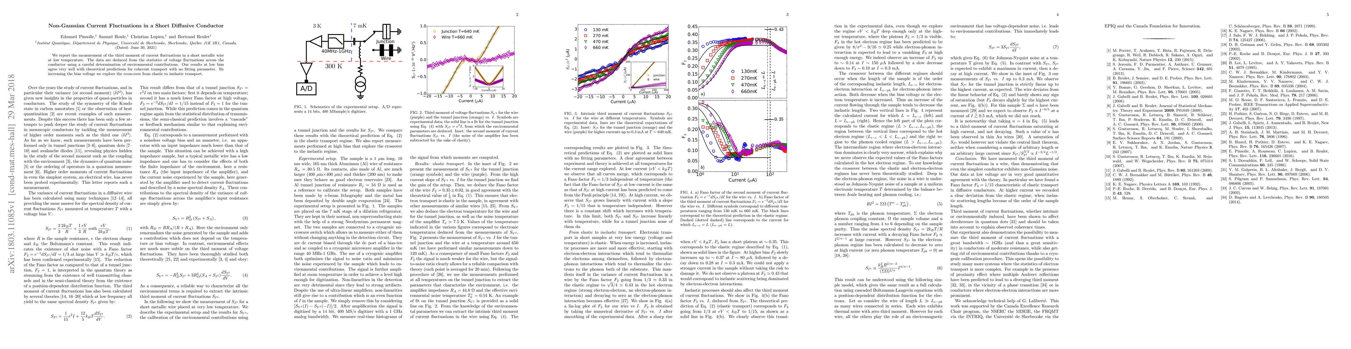 This paper measures the third moment of current fluctuations in a short metallic wire at low temperature, finding agreement with theoretical predictions for coherent transport. The study also investigates the transition from elastic to inelastic transport by increasing the bias voltage.