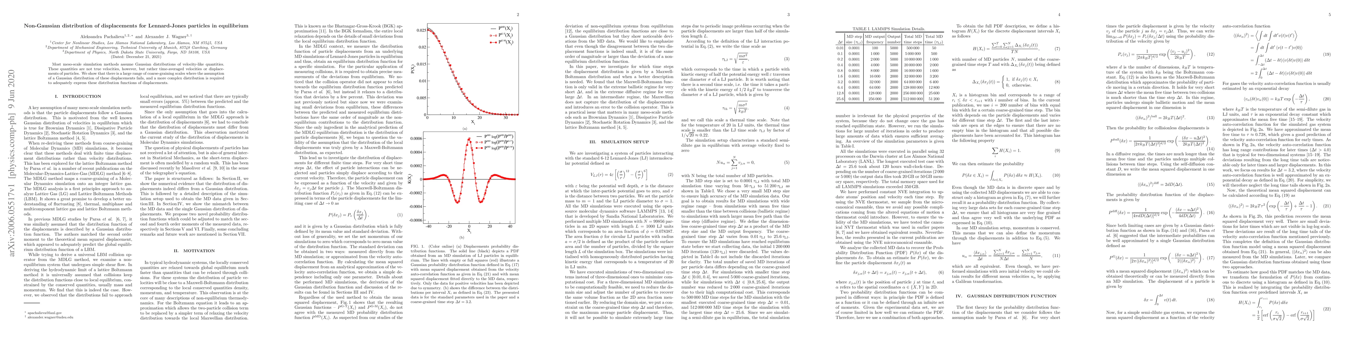 Research shows that displacements of Lennard-Jones particles in equilibrium deviate from Gaussian distributions at various coarse-graining scales, requiring more complex distribution functions to accurately describe them.