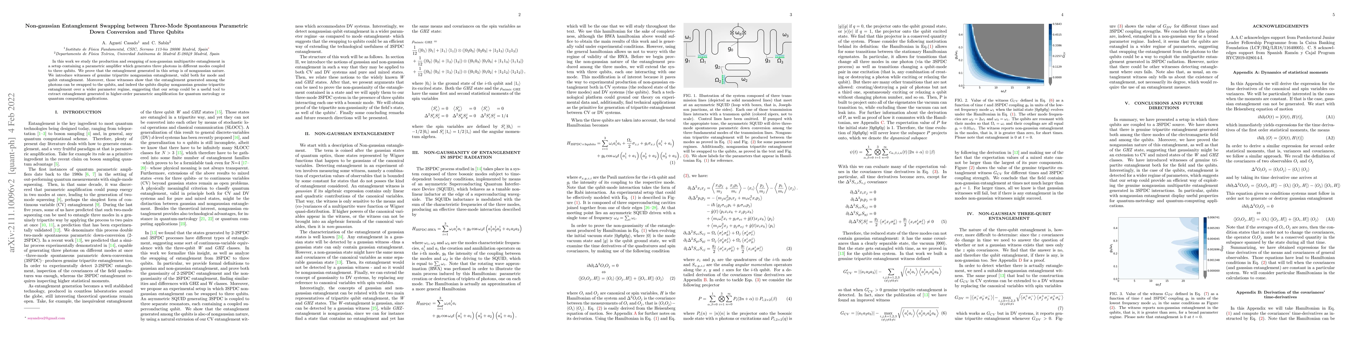 This paper explores the generation and swapping of non-Gaussian multipartite entanglement using three-mode spontaneous parametric down conversion and three qubits. It introduces witnesses for genuine tripartite non-Gaussian entanglement, demonstrating that the entanglement can be transferred from photons to qubits, indicating potential applications in quantum metrology and computing.