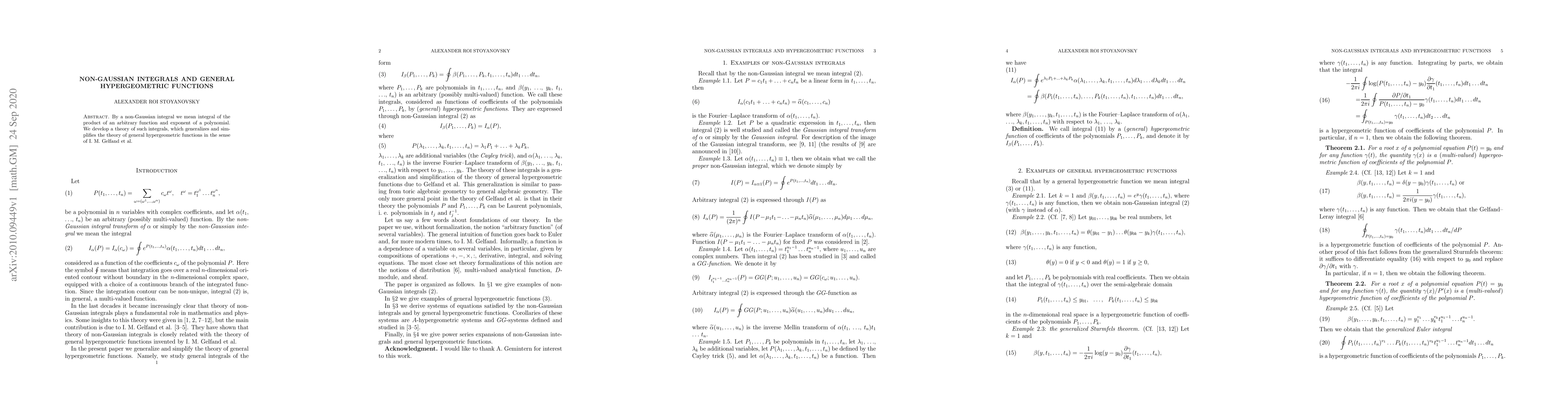 By a non-Gaussian integral we mean integral of the product of an arbitrary function and exponent of a polynomial. We develop a theory of such integrals, which generalizes and simplifies the theory of general hypergeometric functions in the sense of I. M. Gelfand et al.