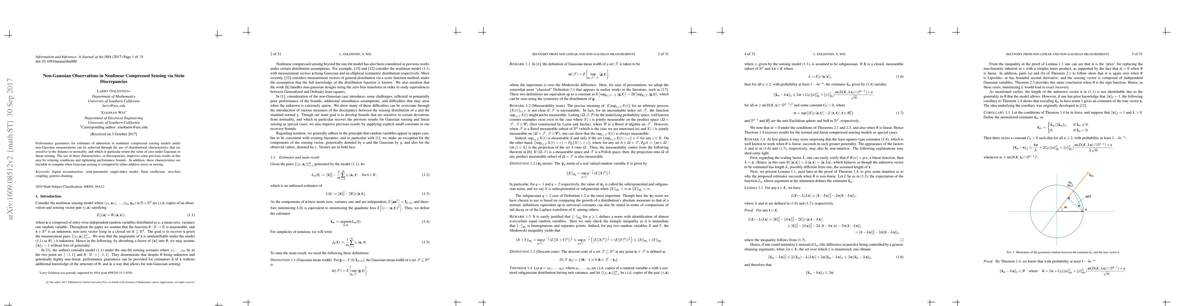 This research introduces Stein discrepancies to enhance performance guarantees in nonlinear compressed sensing with non-Gaussian observations. By using characteristics sensitive to deviation from Gaussian distribution, it relaxes conditions, tightens bounds, and provides computationally feasible methods for Gaussian sensing with errors or mixing.