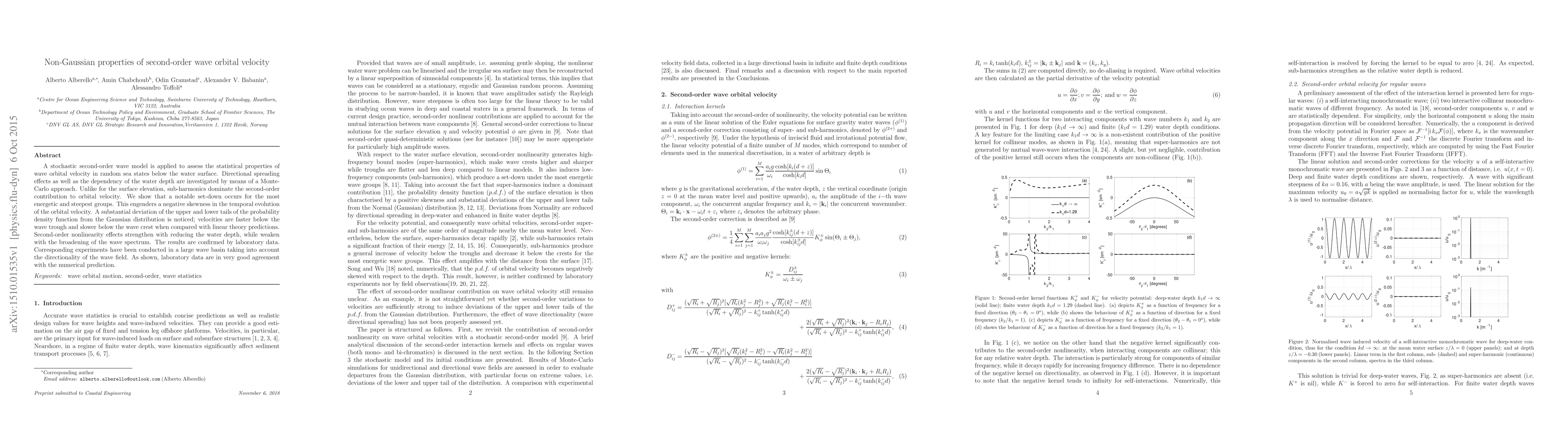 A stochastic second-order wave model is applied to assess the statistical properties of wave orbital velocity in random sea states below the water surface. Directional spreading effects as well as the dependency of the water depth are investigated by means of a Monte-Carlo approach. Unlike for the surface elevation, sub-harmonics dominate the second-order contribution to orbital velocity. We show that a notable set-down occurs for the most energetic and steepest groups. This engenders a negative skewness in the temporal evolution of the orbital velocity. A substantial deviation of the upper and lower tails of the probability density function from the Gaussian distribution is noticed, velocities are faster below the wave trough and slower below the wave crest when compared with linear theory predictions. Second-order nonlinearity effects strengthen with reducing the water depth, while weaken with the broadening of the wave spectrum. The results are confirmed by laboratory data. Corresponding experiments have been conducted in a large wave basin taking into account the directionality of the wave field. As shown, laboratory data are in very good agreement with the numerical prediction.