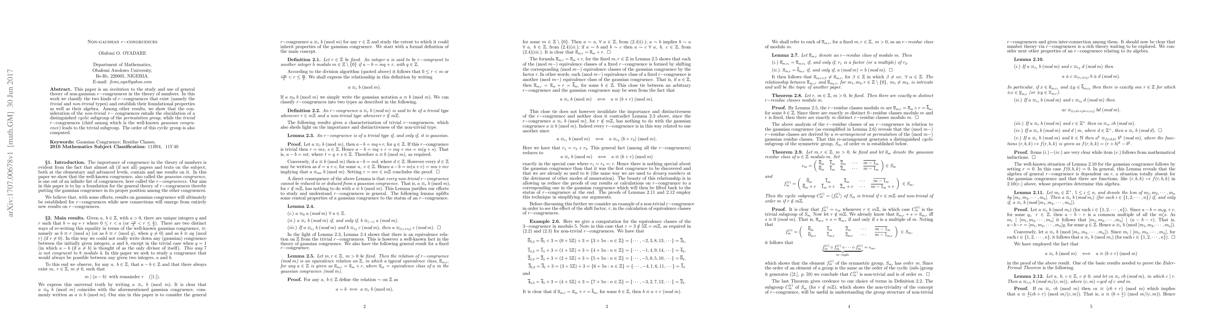 This paper is an invitation to the study and use of general theory of non-gaussian $r-$congruences in the theory of numbers. In this work we classify the two kinds of $r-$congruences that exist (namely the trivial and non-trivial types) and establish their foundational properties as well as their algebra. Among other results, we show that the consideration of the non-trivial $r-$ congruences entails the elucidation of a distinguished cyclic subgroup of the permutation group, while the trivial $r-$congruences (chief among which is the well-known gaussian congruence) leads to the trivial subgroup. The order of this cyclic group is also computed.