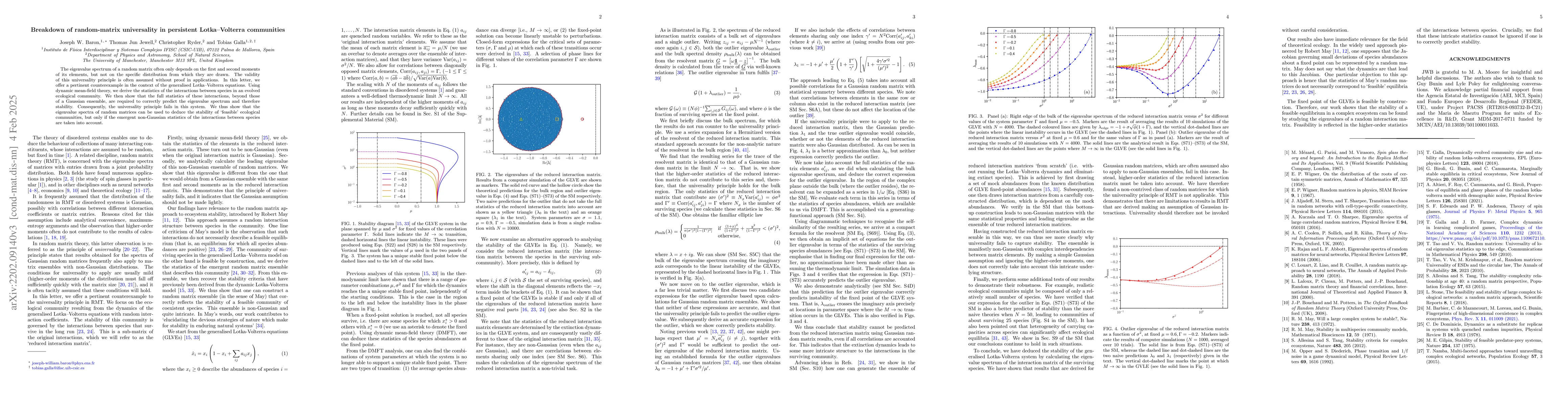 The eigenvalue spectrum of a random matrix often only depends on the first and second moments of its elements, but not on the specific distribution from which they are drawn. The validity of this universality principle is often assumed without proof in applications. In this letter, we offer a pertinent counterexample in the context of the generalised Lotka-Volterra equations. Using dynamic mean-field theory, we derive the statistics of the interactions between species in an evolved ecological community. We then show that the full statistics of these interactions, beyond those of a Gaussian ensemble, are required to correctly predict the eigenvalue spectrum and therefore stability. Consequently, the universality principle fails in this system. Our findings connect two previously disparate ways of modelling complex ecosystems: Robert May's random matrix approach and the generalised Lotka-Volterra equations. We show that the eigenvalue spectra of random matrices can be used to deduce the stability of dynamically constructed (or `feasible') communities, but only if the emergent non-Gaussian statistics of the interactions between species are taken into account.