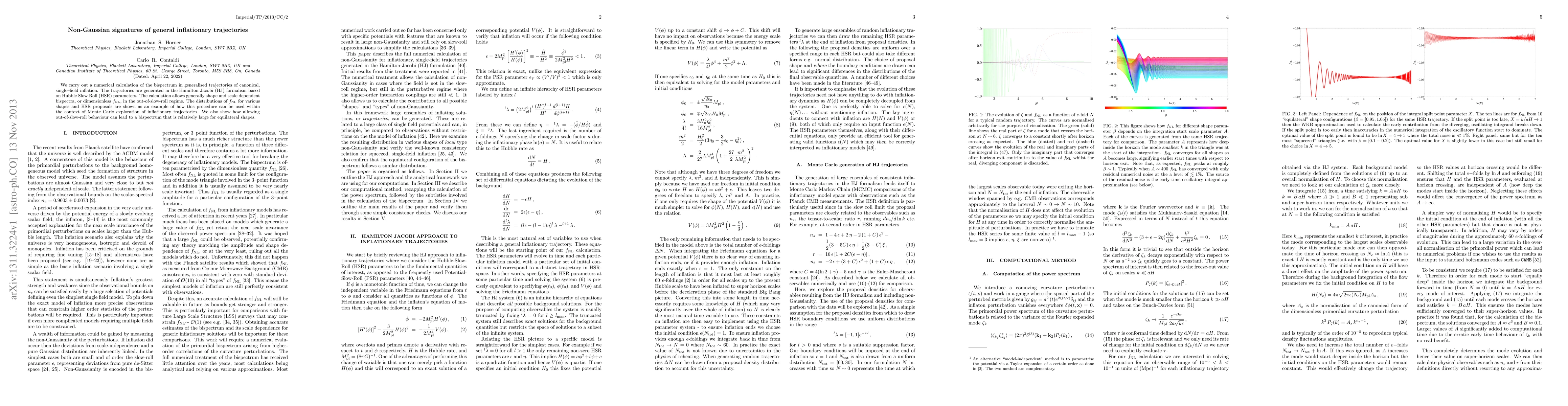 We carry out a numerical calculation of the bispectrum in generalised trajectories of canonical, single--field inflation. The trajectories are generated in the Hamilton-Jacobi (HJ) formalism based on Hubble Slow Roll (HSR) parameters. The calculation allows generally shape and scale dependent bispectra, or dimensionless $f_{NL}$, in the out-of-slow-roll regime. The distributions of $f_{NL}$ for various shapes and HSR proposals are shown as an example of how this procedure can be used within the context of Monte Carlo exploration of inflationary trajectories. We also show how allowing out-of-slow-roll behaviour can lead to a bispectrum that is relatively large for equilateral shapes.