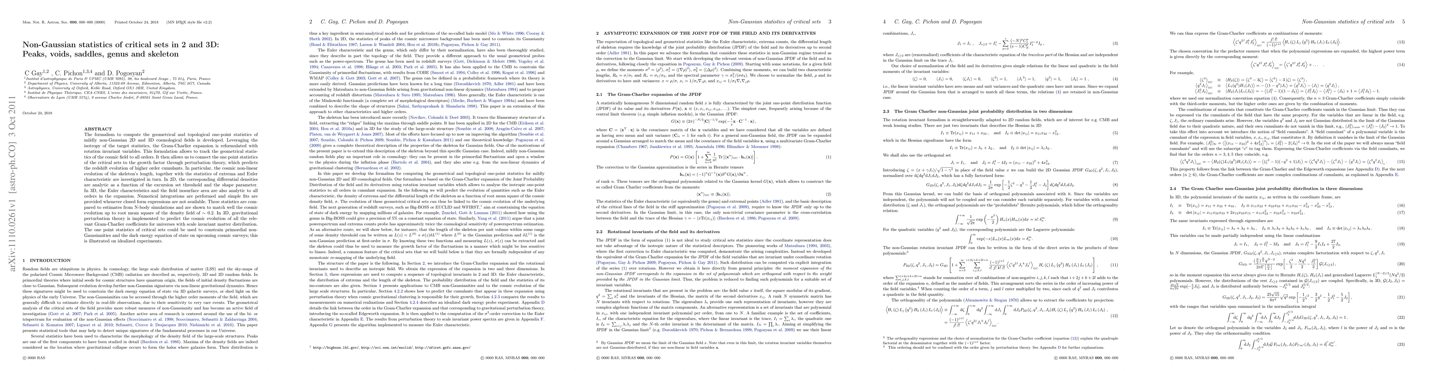 The formalism to compute the geometrical and topological one-point statistics of mildly non-Gaussian 2D and 3D cosmological fields is developed. Leveraging the isotropy of the target statistics, the Gram-Charlier expansion is reformulated with rotation invariant variables. This formulation allows us to track the geometrical statistics of the cosmic field to all orders. It then allows us to connect the one point statistics of the critical sets to the growth factor through perturbation theory, which predicts the redshift evolution of higher order cumulants. In particular, the cosmic non-linear evolution of the skeleton's length, together with the statistics of extrema and Euler characteristic are investigated in turn. In 2D, the corresponding differential densities are analytic as a function of the excursion set threshold and the shape parameter. In 3D, the Euler characteristics and the field isosurface area are also analytic to all orders in the expansion. Numerical integrations are performed and simple fits are provided whenever closed form expressions are not available. These statistics are compared to estimates from N-body simulations and are shown to match well the cosmic evolution up to root mean square of the density field of ~0.2. In 3D, gravitational perturbation theory is implemented to predict the cosmic evolution of all the relevant Gram-Charlier coefficients for universes with scale invariant matter distribution. The one point statistics of critical sets could be used to constrain primordial non-Gaussianities and the dark energy equation of state on upcoming cosmic surveys; this is illustrated on idealized experiments.