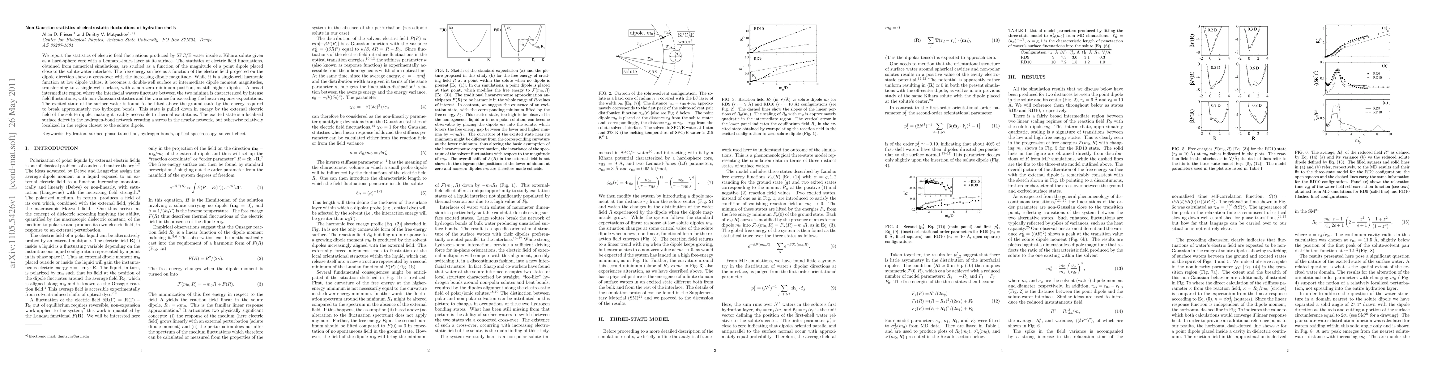 We report the statistics of electric field fluctuations produced by SPC/E water inside a Kihara solute given as a hard-sphere core with a Lennard-Jones layer at its surface. The statistics of electric field fluctuations, obtained from numerical simulations, are studied as a function of the magnitude of a point dipole placed close to the solute-water interface. The free energy surface as a function of the electric field projected on the dipole direction shows a cross-over with the increasing dipole magnitude. While it is a single-well harmonic function at low dipole values, it becomes a double-well surface at intermediate dipole moment magnitudes, transforming to a single-well surface, with a non-zero minimum position, at still higher dipoles. A broad intermediate region where the interfacial waters fluctuate between the two minima is characterized by intense field fluctuations, with non-Gaussian statistics and the variance far exceeding the linear-response expectations. The excited state of the surface water is found to be lifted above the ground state by the energy required to break approximately two hydrogen bonds. This state is pulled down in energy by the external electric field of the solute dipole, making it readily accessible to thermal excitations. The excited state is a localized surface defect in the hydrogen-bond network creating a stress in the nearby network, but otherwise relatively localized in the region closest to the solute dipole.