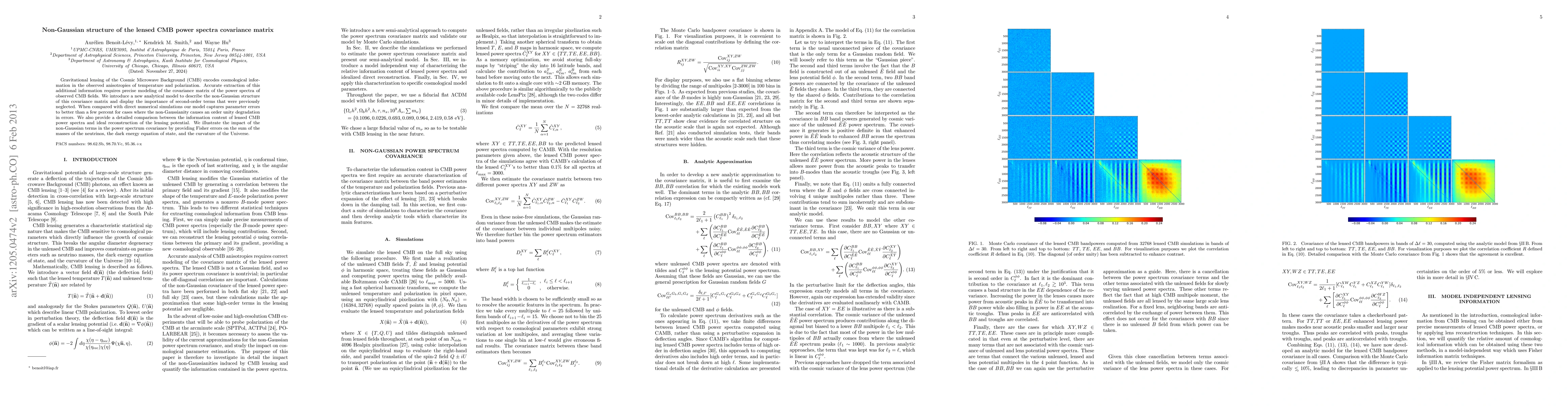 This paper introduces an analytical model to describe the non-Gaussian structure of the lensed CMB power spectra covariance matrix, emphasizing the importance of second-order terms. The model accurately captures parameter errors compared to numerical simulations, highlighting the impact of non-Gaussianity on cosmological parameters such as neutrino masses, dark energy, and curvature.