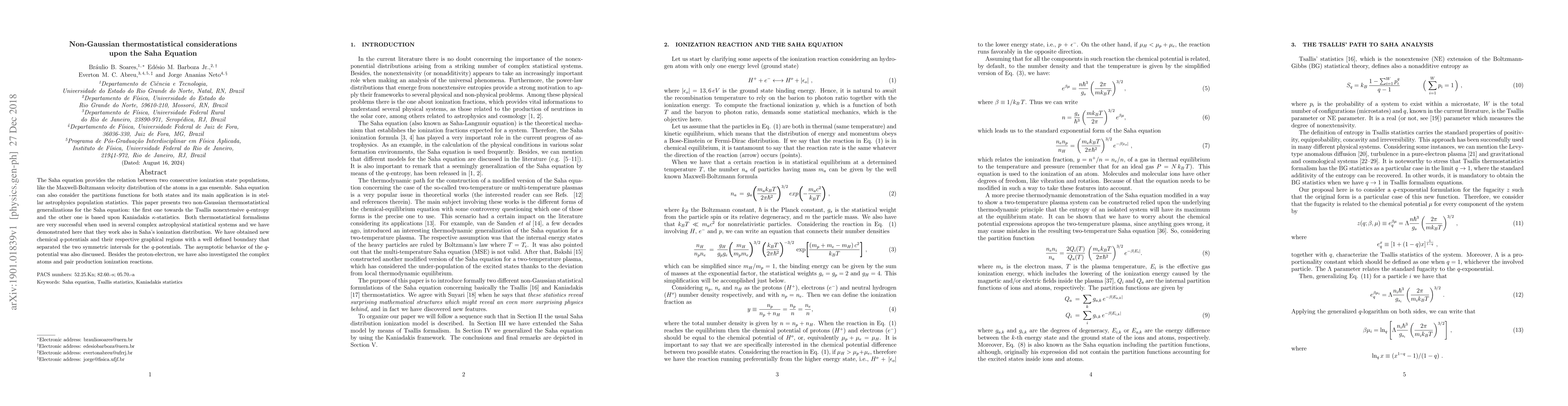 This paper generalizes the Saha equation using non-Gaussian thermostatistical approaches, specifically Tsallis and Kaniadakis statistics, to better model complex astrophysical systems. It demonstrates the effectiveness of these methods in ionization distributions and explores their application in proton-electron and complex atom reactions.
