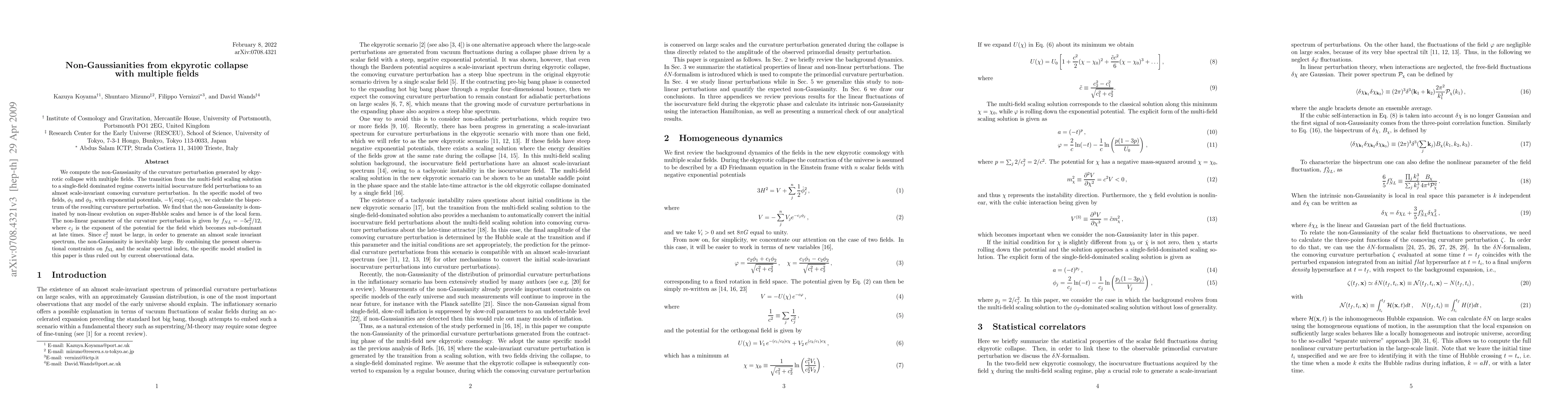 This paper investigates the non-Gaussianity in curvature perturbations generated by ekpyrotic collapse with multiple fields, finding it to be of local form due to non-linear evolution. The model with two fields and exponential potentials yields a non-linear parameter $f_{NL} = 5 c_j^2 /12$, which is ruled out by current observational constraints.