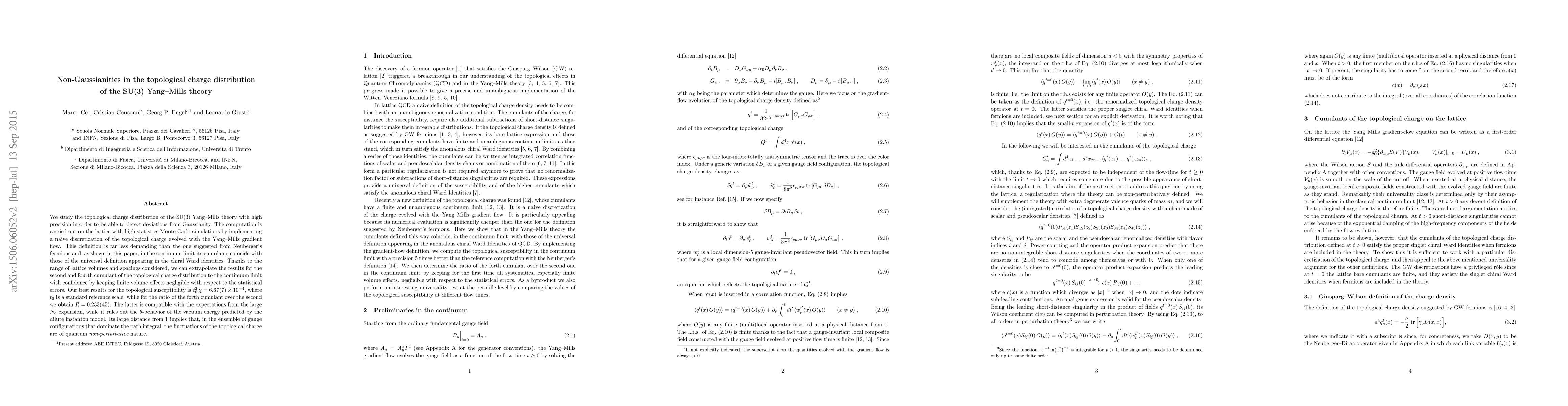 We study the topological charge distribution of the SU(3) Yang--Mills theory with high precision in order to be able to detect deviations from Gaussianity. The computation is carried out on the lattice with high statistics Monte Carlo simulations by implementing a naive discretization of the topological charge evolved with the Yang--Mills gradient flow. This definition is far less demanding than the one suggested from Neuberger's fermions and, as shown in this paper, in the continuum limit its cumulants coincide with those of the universal definition appearing in the chiral Ward identities. Thanks to the range of lattice volumes and spacings considered, we can extrapolate the results for the second and fourth cumulant of the topological charge distribution to the continuum limit with confidence by keeping finite volume effects negligible with respect to the statistical errors. Our best results for the topological susceptibility is t_0^2*chi=6.67(7)*10^-4, where t_0 is a standard reference scale, while for the ratio of the forth cumulant over the second we obtain R=0.233(45). The latter is compatible with the expectations from the large Nc expansion, while it rules out the theta-behavior of the vacuum energy predicted by the dilute instanton model. Its large distance from 1 implies that, in the ensemble of gauge configurations that dominate the path integral, the fluctuations of the topological charge are of quantum non-perturbative nature.