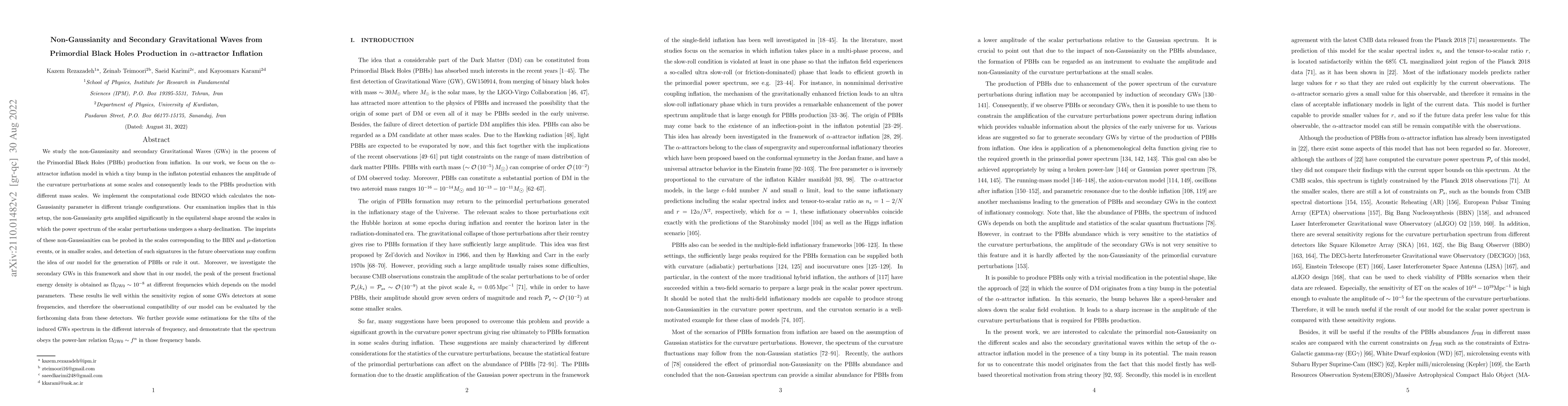 We study the non-Gaussianity and secondary Gravitational Waves (GWs) in the process of the Primordial Black Holes (PBHs) production from inflation. In our work, we focus on the $\alpha$-attractor inflation model in which a tiny bump in the inflaton potential enhances the amplitude of the curvature perturbations at some scales and consequently leads to the PBHs production with different mass scales. We implement the computational code BINGO which calculates the non-Gaussianity parameter in different triangle configurations. Our examination implies that in this setup, the non-Gaussianity gets amplified significantly in the equilateral shape around the scales in which the power spectrum of the scalar perturbations undergoes a sharp declination. The imprints of these non-Gaussianities can be probed in the scales corresponding to the BBN and $\mu$-distortion events, or in smaller scales, and detection of such signatures in the future observations may confirm the idea of our model for the generation of PBHs or rule it out. Moreover, we investigate the secondary GWs in this framework and show that in our model, the peak of the present fractional energy density is obtained as $\Omega_{\rm GW0} \sim 10^{-8}$ at different frequencies which depends on the model parameters. These results lie well within the sensitivity region of some GWs detectors at some frequencies, and therefore the observational compatibility of our model can be evaluated by the forthcoming data from these detectors. We further provide some estimations for the tilts of the induced GWs spectrum in the different intervals of frequency, and demonstrate that the spectrum obeys the power-law relation $\Omega_{\rm GW0}\sim f^{n}$ in those frequency bands.