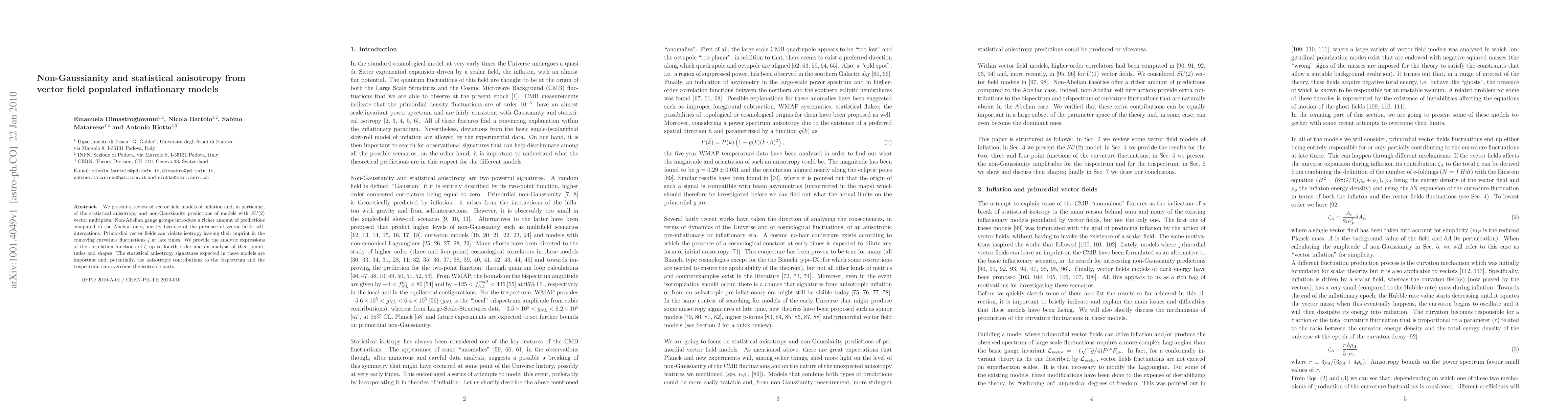 We present a review of vector field models of inflation and, in particular, of the statistical anisotropy and non-Gaussianity predictions of models with SU(2) vector multiplets. Non-Abelian gauge groups introduce a richer amount of predictions compared to the Abelian ones, mostly because of the presence of vector fields self-interactions. Primordial vector fields can violate isotropy leaving their imprint in the comoving curvature fluctuations zeta at late times. We provide the analytic expressions of the correlation functions of zeta up to fourth order and an analysis of their amplitudes and shapes. The statistical anisotropy signatures expected in these models are important and, potentially, the anisotropic contributions to the bispectrum and the trispectrum can overcome the isotropic parts.