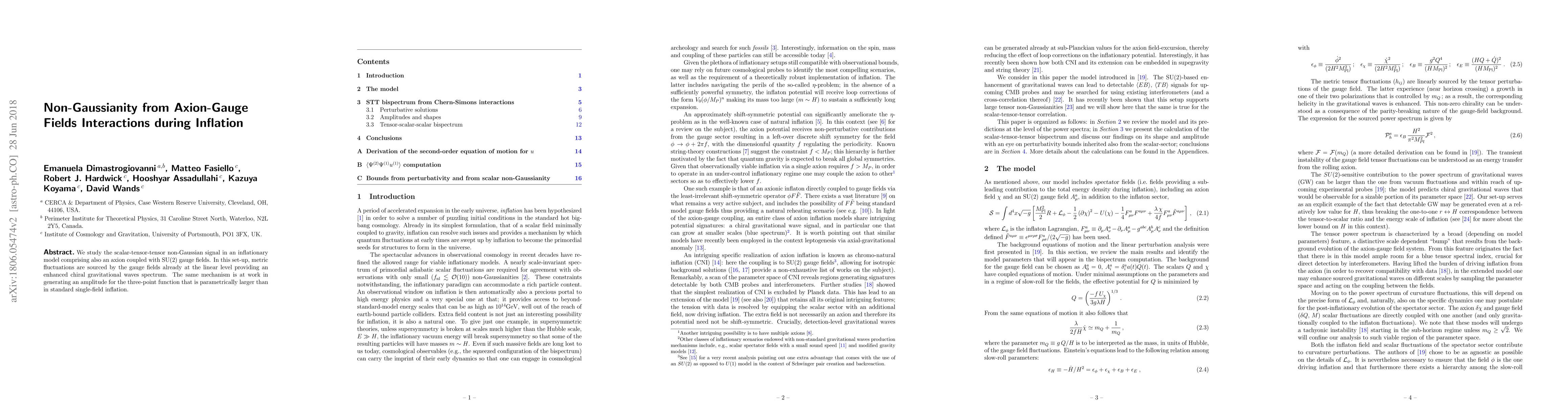 This paper investigates the scalar-tensor-tensor non-Gaussian signal in an inflationary model where an axion interacts with SU(2) gauge fields, leading to an enhanced chiral gravitational waves spectrum and a significantly larger amplitude for the three-point function compared to standard single-field inflation.