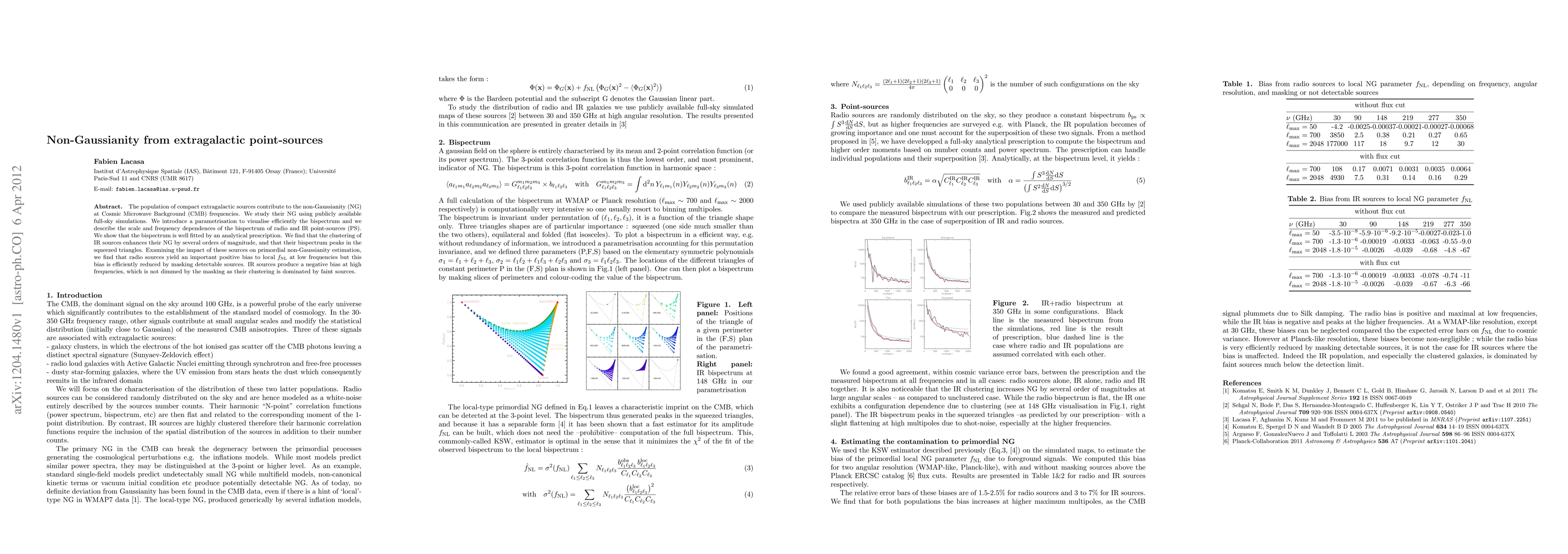 The population of compact extragalactic sources contribute to the non-Gaussianity at Cosmic Microwave Background frequencies. We study their non-Gaussianity using publicly available full-sky simulations. We introduce a parametrisation to visualise efficiently the bispectrum and we describe the scale and frequency dependences of the bispectrum of radio and IR point-sources. We show that the bispectrum is well fitted by an analytical prescription. We find that the clustering of IR sources enhances their non-Gaussianity by several orders of magnitude, and that their bispectrum peaks in the squeezed triangles. Examining the impact of these sources on primordial non-Gaussianity estimation, we find that radio sources yield an important positive bias to local fNL at low frequencies but this bias is efficiently reduced by masking detectable sources. IR sources produce a negative bias at high frequencies, which is not dimmed by the masking, as their clustering is dominated by faint sources.