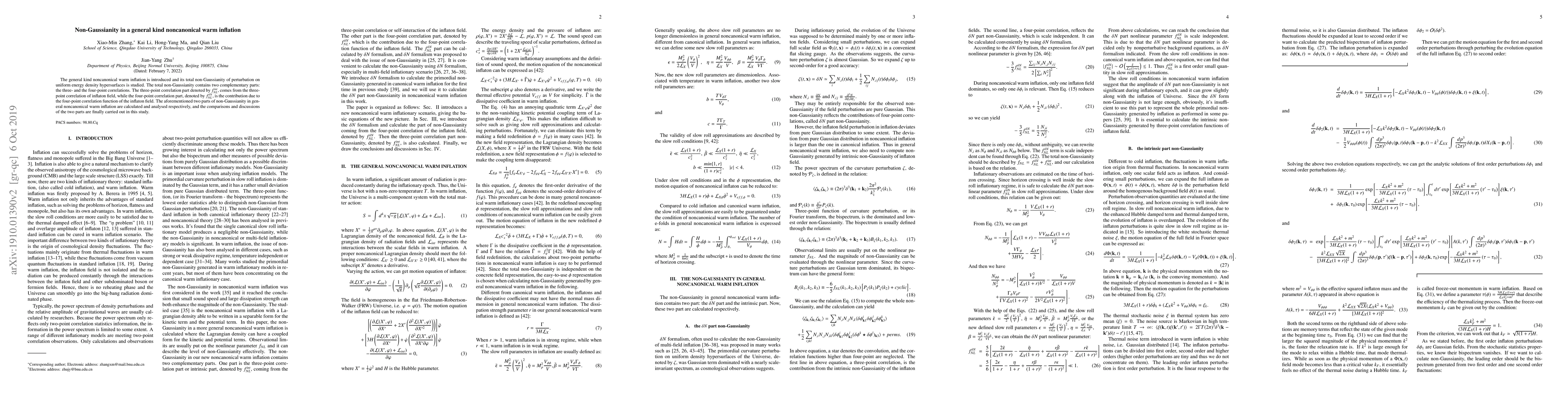 This paper introduces a general kind noncanonical warm inflation model and analyzes its total non-Gaussianity, which consists of three-point and four-point correlations of the inflaton field. The study finds distinct contributions from both the three-point correlation ($f^{int}_{NL}$) and the four-point correlation ($f_{NL}^{\delta N}$) to the overall non-Gaussianity.