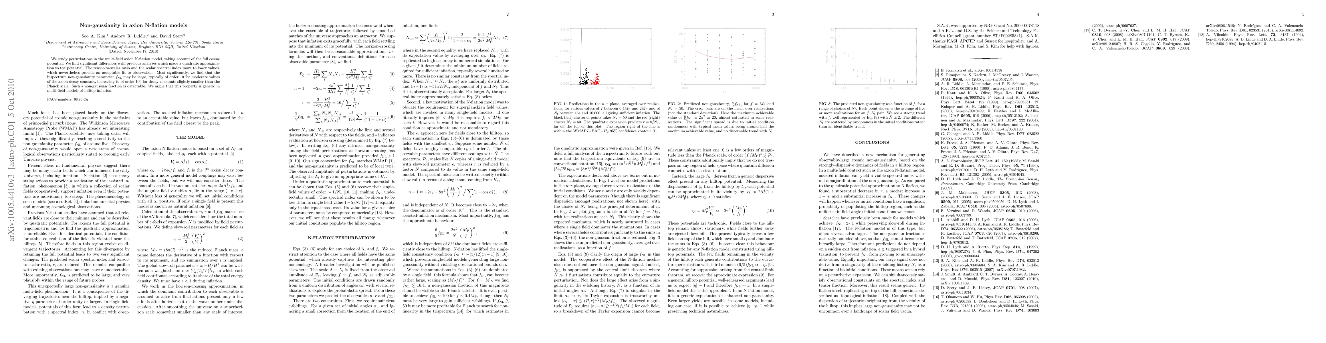 This paper investigates perturbations in a multi-field axion Nflation model with a full cosine potential, revealing significant deviations from previous quadratic approximations. It finds that the tensor-to-scalar ratio and scalar spectral index decrease, while the bispectrum non-gaussianity parameter f_NL can be large, potentially detectable, indicating a generic feature in multi-field hilltop inflation models.