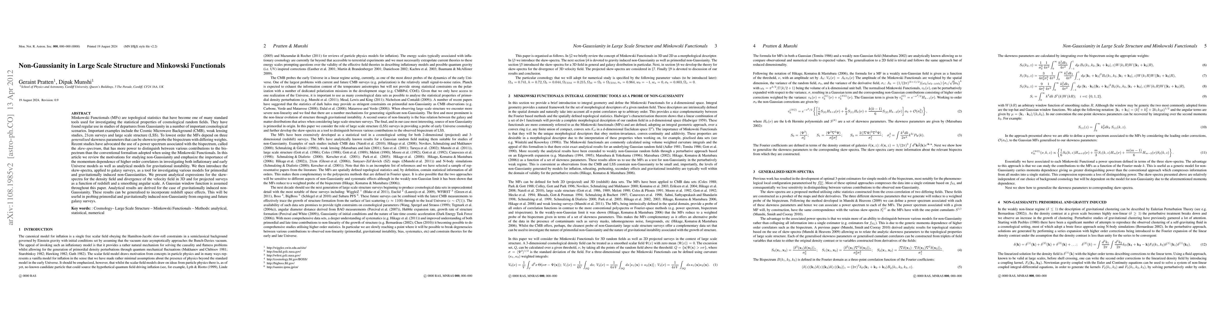 Minkowski Functionals (MFs) are topological statistics that have become one of many standard tools used for investigating the statistical properties of cosmological random fields. They have found regular use in studies of departures from Gaussianity in a number of important cosmological scenarios. Important examples include the Cosmic Microwave Background (CMB), weak lensing studies, 21cm surveys and large scale structure (LSS). To lowest order the MFs depend on three generalised skewness parameters that can be shown to probe the bispectrum with differing weights. Recent studies have advocated the use of a power spectrum associated with the bispectrum, called the skew-spectrum, that has more power to distinguish between various contributions to the bispectrum than the conventional formalism adopted when using the Minkowski Functionals. In this article we review the motivations for studying non-Gaussianity and emphasize the importance of the momentum dependence of higher order correlators in investigating both inflationary and early Universe models as well as analytical models for gravitational instability. We then introduce the skew-spectra, applied to galaxy surveys, as a tool for investigating various models for primordial and gravitationally induced non-Gaussianities. We present analytical expressions for the skew-spectra for the density field and divergence of the velocity field in 3D and for projected surveys as a function of redshift and a smoothing angular scale. A Gaussian window function is assumed throughout this paper. Analytical results are derived for the case of gravitationally induced non-Gaussianity. These results can be generalised to incorporate redshift space effects. This will be useful in probing primordial and gravitationally induced non-Gaussianity from ongoing and future galaxy surveys.