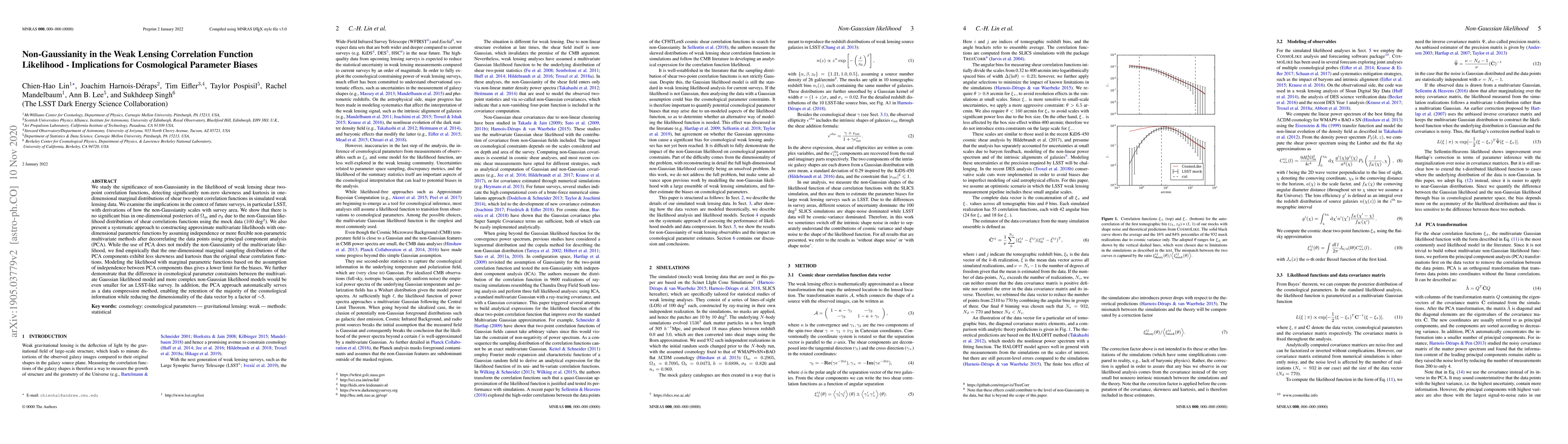 We study the significance of non-Gaussianity in the likelihood of weak lensing shear two-point correlation functions, detecting significantly non-zero skewness and kurtosis in one-dimensional marginal distributions of shear two-point correlation functions in simulated weak lensing data. We examine the implications in the context of future surveys, in particular LSST, with derivations of how the non-Gaussianity scales with survey area. We show that there is no significant bias in one-dimensional posteriors of $\Omega_{\rm m}$ and $\sigma_{\rm 8}$ due to the non-Gaussian likelihood distributions of shear correlations functions using the mock data ($100$ deg$^{2}$). We also present a systematic approach to constructing approximate multivariate likelihoods with one-dimensional parametric functions by assuming independence or more flexible non-parametric multivariate methods after decorrelating the data points using principal component analysis (PCA). While the use of PCA does not modify the non-Gaussianity of the multivariate likelihood, we find empirically that the one-dimensional marginal sampling distributions of the PCA components exhibit less skewness and kurtosis than the original shear correlation functions.Modeling the likelihood with marginal parametric functions based on the assumption of independence between PCA components thus gives a lower limit for the biases. We further demonstrate that the difference in cosmological parameter constraints between the multivariate Gaussian likelihood model and more complex non-Gaussian likelihood models would be even smaller for an LSST-like survey. In addition, the PCA approach automatically serves as a data compression method, enabling the retention of the majority of the cosmological information while reducing the dimensionality of the data vector by a factor of $\sim$5.