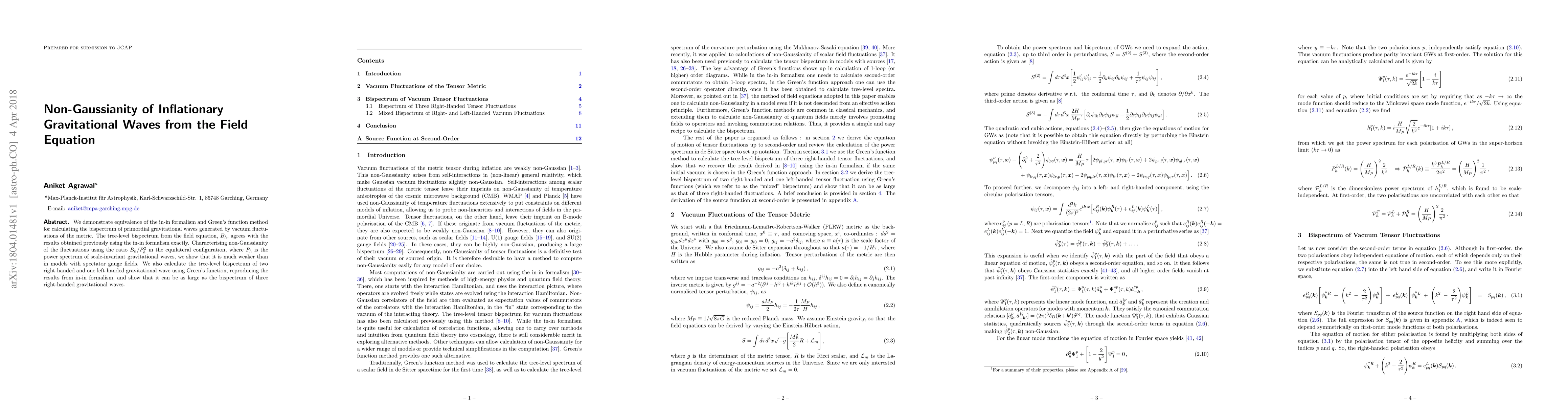 We demonstrate equivalence of the in-in formalism and Green's function method for calculating the bispectrum of primordial gravitational waves generated by vacuum fluctuations of the metric. The tree-level bispectrum from the field equation, $B_h$, agrees with the results obtained previously using the in-in formalism exactly. Characterising non-Gaussianity of the fluctuations using the ratio $B_h/P^2_h$ in the equilateral configuration, where $P_h$ is the power spectrum of scale-invariant gravitational waves, we show that it is much weaker than in models with spectator gauge fields. We also calculate the tree-level bispectrum of two right-handed and one left-handed gravitational wave using Green's function, reproducing the results from in-in formalism, and show that it can be as large as the bispectrum of three right-handed gravitational waves.