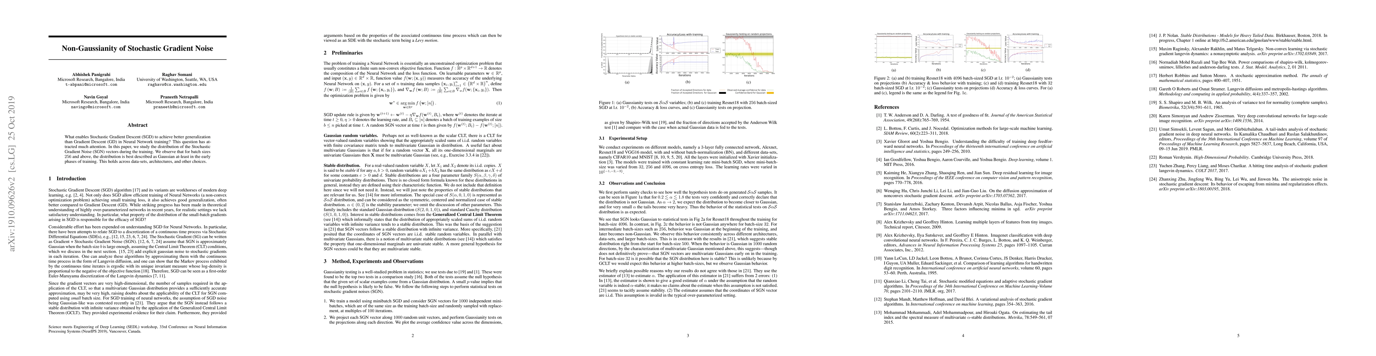What enables Stochastic Gradient Descent (SGD) to achieve better generalization than Gradient Descent (GD) in Neural Network training? This question has attracted much attention. In this paper, we study the distribution of the Stochastic Gradient Noise (SGN) vectors during the training. We observe that for batch sizes 256 and above, the distribution is best described as Gaussian at-least in the early phases of training. This holds across data-sets, architectures, and other choices.