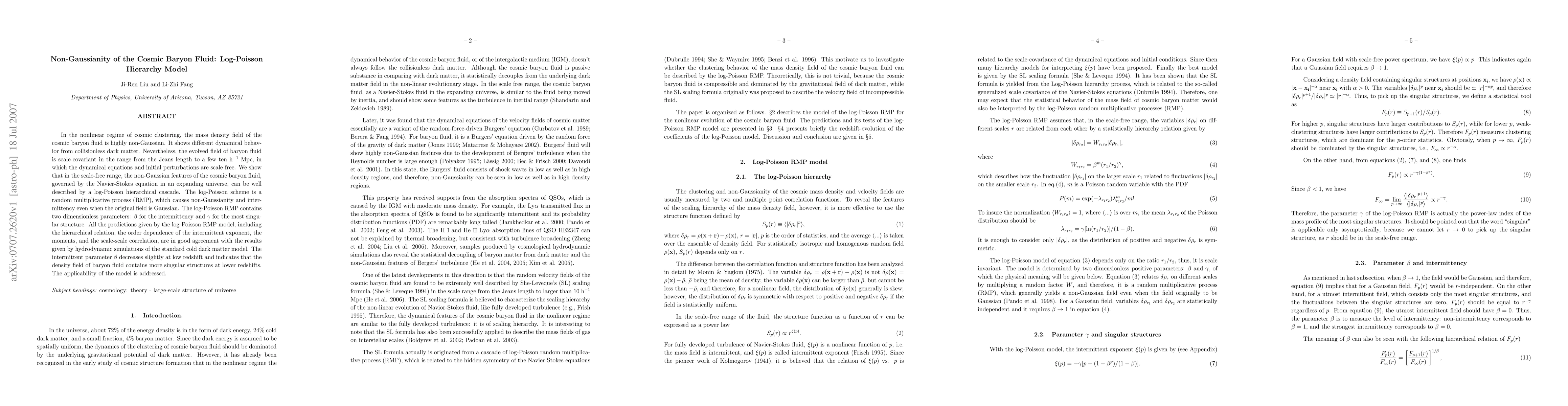 This paper proposes a log-Poisson hierarchical cascade model to describe the non-Gaussian features of the cosmic baryon fluid in the nonlinear regime, showing good agreement with hydrodynamic simulations. The model's parameters, $\beta$ and $\gamma$, indicate that the baryon fluid's density field contains more singular structures at lower redshifts.