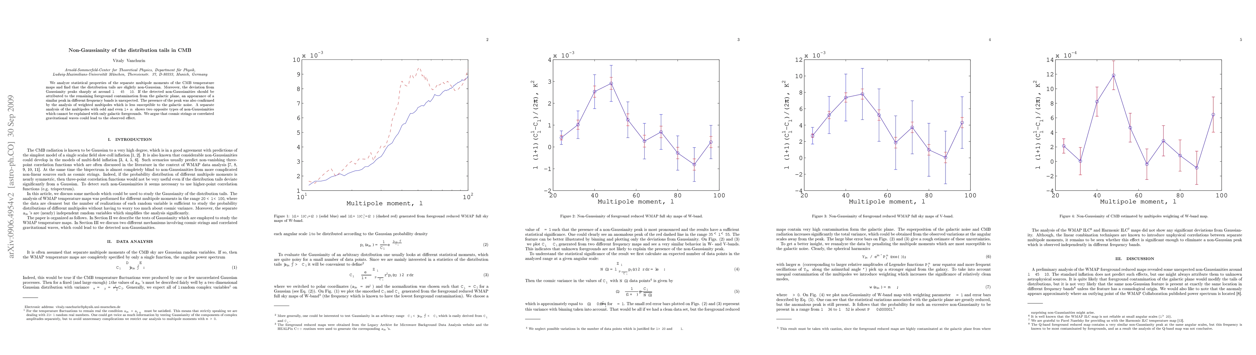 We analyze statistical properties of the separate multipole moments of the CMB temperature maps and find that the distribution tails are slightly non-Gaussian. Moreover, the deviation from Gaussianity peaks sharply at around $l\sim45\pm10$. If the detected non-Gaussianities should be attributed to the remaining foreground contamination from the galactic plane, an appearance of a similar peak in different frequency bands is unexpected. The presence of the peak was also confirmed by the analysis of weighted multipoles which is less susceptible to the galactic noise. A separate analysis of the multipoles with odd and even $l+m$ shows two opposite types of non-Gaussianities which cannot be explained with only galactic foregrounds. We argue that cosmic strings or correlated gravitational waves could lead to the observed effect.