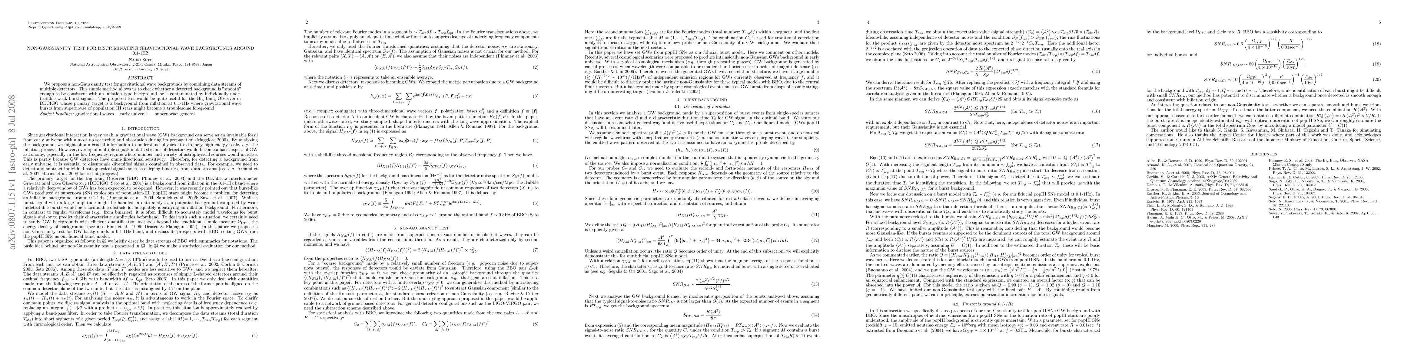 This paper proposes a non-Gaussianity test to distinguish gravitational wave backgrounds from 0.1-1Hz, combining data from multiple detectors to identify smooth, inflation-consistent backgrounds versus weak burst signals. This method is crucial for detecting inflationary backgrounds amidst potential supernovae interference for future observatories like the Big Bang Observer or DECIGO.